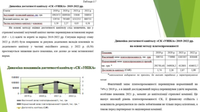 У роботі Яременко Л.І. розглянуто етапи формування ризик-менеджменту страхових компаній, методи мінімізації їх ризиків, висвітлено суть концепції ризик-менеджменту підприємства у контексті фінансової стійкості. Магістрантка проаналізувала ризик-фактори, які впливали на дiяльнiсть ПрАТ «СК «УНІКА» протягом 2019-2022 рр., показники фінансово-господарської діяльності страховика за досліджуваний період та оцінила ризик страхової компанії як чинника антикризового управління.