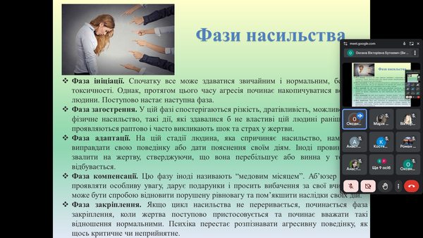 В рамках Всеукраїнської акції «16 днів проти насильства» 3 та 5 грудня 2024 року відбулись зустрічі психолога ЦДУ ім. В.Винниченка Оксани Миколаївни Гурової зі студентами груп ЕК22Б, ЕК24Б та МЛ22Б спеціальності 051 Економіка ОП Економічна безпека, факультету математики, природничих наук та технологій на теми «Я маю право жити без насильства» і «Стереотипи в роботі психолога» .