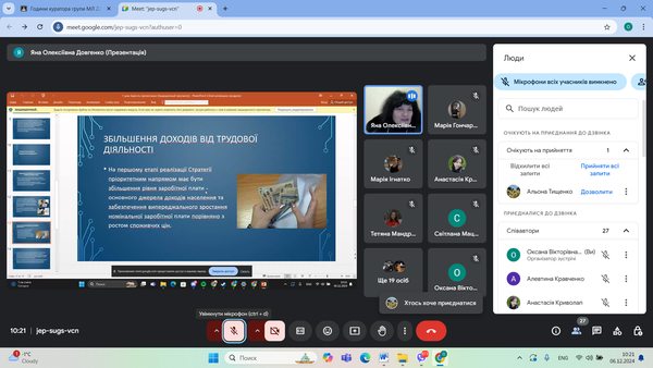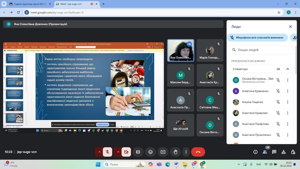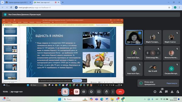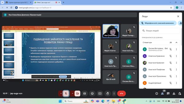 Доцент Яна Довгенко розкрила шляхи реалізації сталого розвитку суспільства, стратегічні плани подолання бідності, а саме зупинилася на шляхах підвищення зайнятості населення та розвитку ринку праці, збільшення доходів від трудової діяльності, соціальному страхуванні, як способі захисту осіб від втрати доходу тощо.