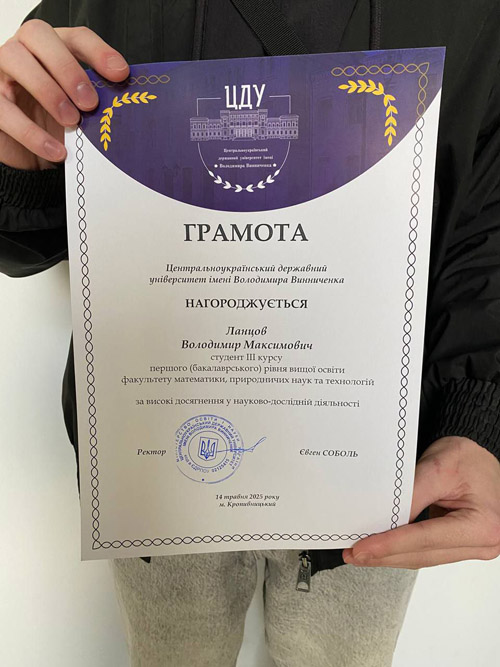 14 травня 2025 року здобувача першого (бакалаврського) рівня вищої освіти групи МЛ22Б спеціальності 073 «Менеджмент»Ланцова Володимира було нагороджено грамотою за високі досягнення у науково-дослідницькій діяльності з нагоди Дня науки.