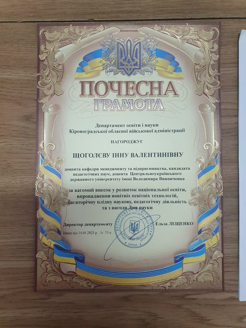 Щоголєву Інну Валентинівну, к.п.н., доцента, доцента кафедри менеджменту та підприємництва - з нагородженням почесною грамотою Департамента освіти і науки Кіровоградської обласної військової адміністрації за вагомий внесок у розвиток національної освіти, впровадження новітніх освітніх технологій, багаторічну плідну наукову, педагогічну діяльність та з нагоди Дня науки.
