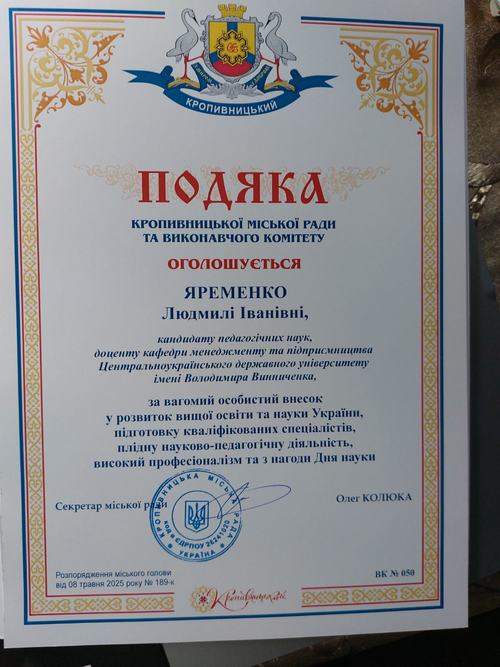 Яременко Людмилу Іванівну, к.п.н., доцента, доцента кафедри менеджменту та підприємництва - з оголошеною подякою від Кропивницької міської ради та виконаного комітету за вагомий особистий внесок у розвиток вищої освіти та науки України, підготовку кваліфікованих спеціалістів, плідну науково-педагогічну діяльність, високий професіоналізм та з нагоди Дня науки.