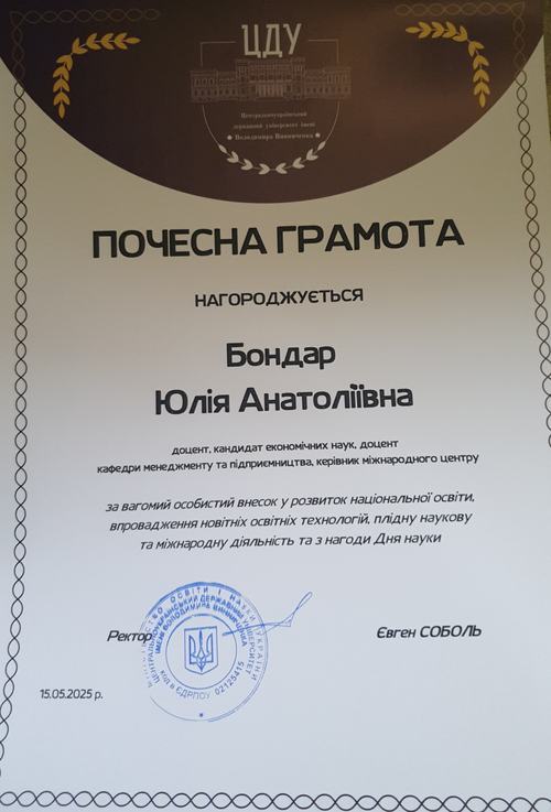 Бондар Юлію Анатоліївну к.е.н., доцента, доцента кафедри менеджменту та підприємництва - з нагородженням почесною грамотою Центральноукраїнського державного університету імені Володимира Винниченка за вагомий особистий внесок у розвиток національної освіти, впровадження новітніх освітніх технологій, плідну наукову та міжнародну діяльність та з нагоди Дня науки.