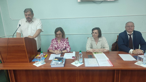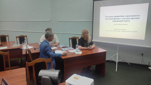 Захист проходив у межах засідання разової спеціалізованої вченої ради ІD 8442, до складу якої увійшли авторитетні фахівці у сфері педагогічної науки та методики навчання фізики: д.пед.н., проф. О.М. Трифонова (голова ради), д.пед.н., проф. І.В. Сальник (рецензент), к.пед.н., доц. Е.П. Сірик (рецензент), д.пед.н., проф., професор кафедри фізики Кам'янець-Подільського національного університету імені Івана Огієнка А.М. Кух (опонент), д.пед.н., проф., професор кафедри експериментальної фізики, інформаційних та освітніх технологій Волинського національного університету імені Лесі Українки О.С. Мартинюк (опонент). Члени разової спеціалізованої вченої ради одностайно відмітили актуальність представленого дослідження. Під час проведення захисту члени ради та присутні обговорили ключові питання сучасної фахової освіти. У дискусіях були висловлені думки науковців і практиків, які поділилися досвідом та пропозиціями щодо вдосконалення освітнього процесу у закладах фахової передвищої та вищої освіти.
