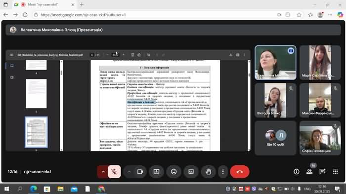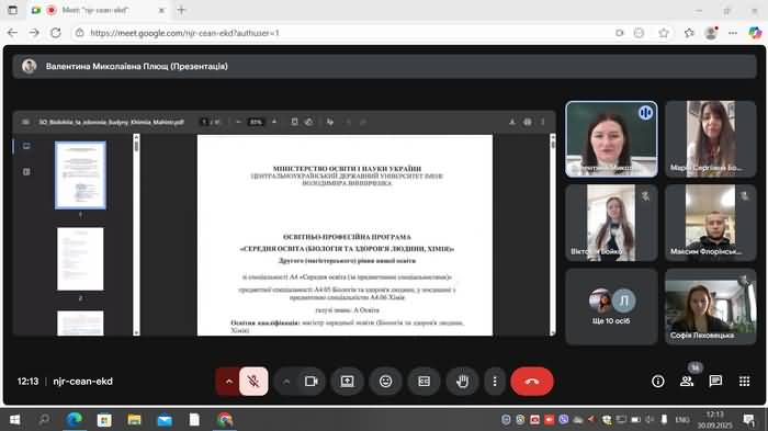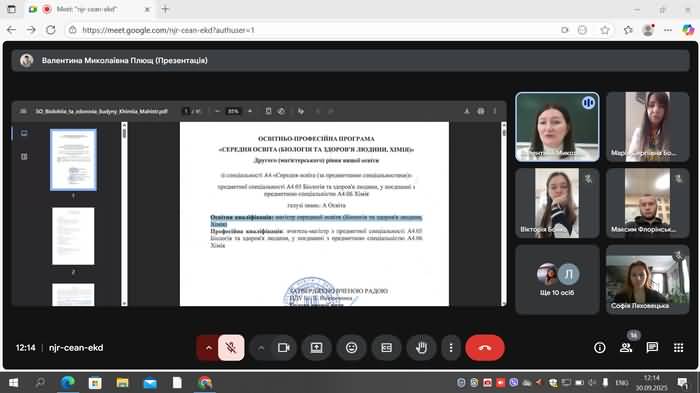 30 вересня 2025 року відбулась онлайн зустріч розробників ОП «Середня освіта (Біологія та здоров'я людини, Хімія)» першого (бакалаврського) та другого (магістерського) рівнів вищої освіти Валентини ПЛЮЩ (гарант ОП «Середня освіта (Біологія та здоров'я людини, Хімія)» другого (магістерського) рівня вищої освіти) та Марії Бобрової гарант ОП «Середня освіта (Біологія та здоров'я людини, Хімія)» першого (бакалаврського) рівня вищої освіти) зі здобувачами освіти.