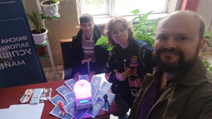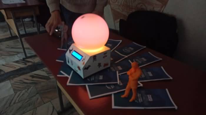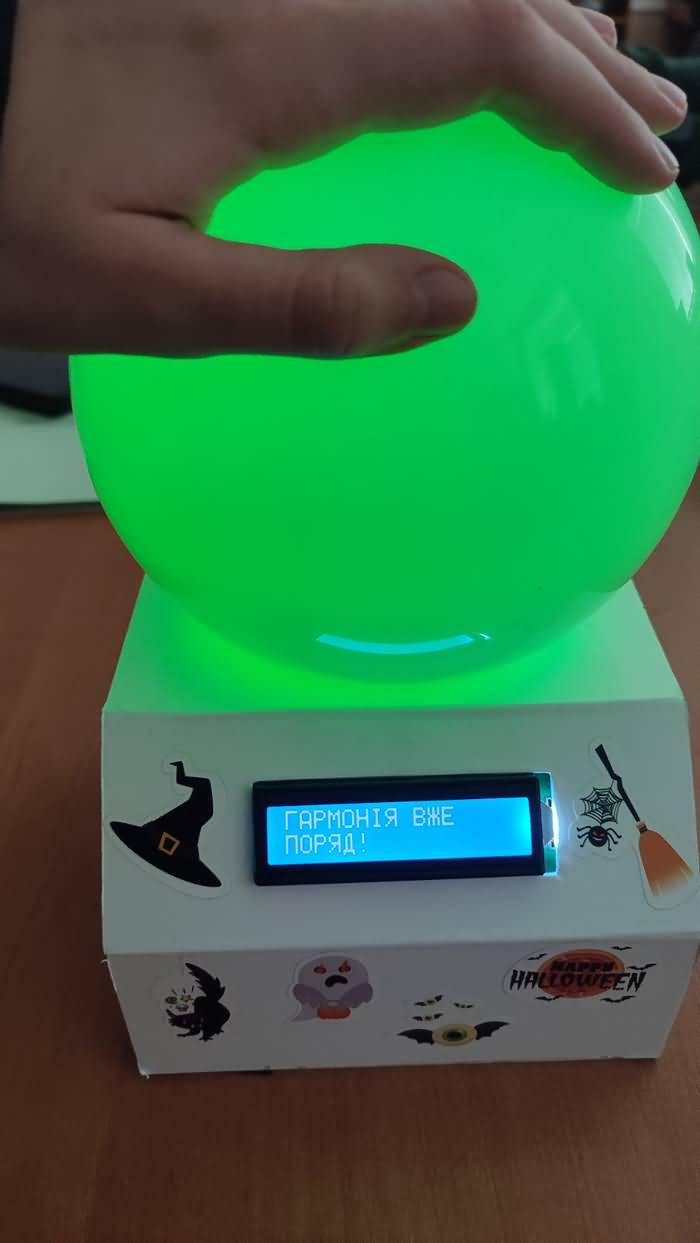 Свою участь у заході взяли і наші студенти групи ЦТ23Б Юрій Колесник, Софія Побіяха та старший викладач Дмитро Соменко, презентувавши розробку – «Кулю передбачень». Цей яскравий проєкт одразу привернув увагу відвідувачів завдяки мерехтливому світлу та унікальності серед інших. Адже ніщо так не заспокоює і не викликає інтересу, як відповіді на запитання, які давно бентежать, особливо від інтерактивного рандомайзеру. Багато гостей кидали зацікавлені погляди, та підходили щоб випробувати кулю на практиці, ставлячи їй як звичайні, так і важливі чи особисті запитання. Наша команда щиро сподівається, що ці відповіді подарували гарний настрій і трохи віри в себе та в наше майбутнє.
