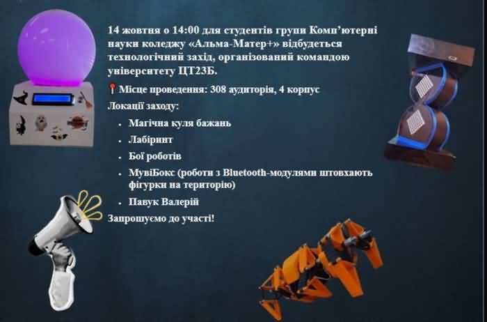 14 жовтня 2025 р. студенти групи «Комп'ютерні науки» Фахового коледжу «Альма-матер. Плюс» Центральноукраїнського державного університету імені Володимира Винниченка відвідали захопливий технологічний захід, присвячений світові робототехніки. Організаторами інноваційного дійства виступили студенти групи ЦТ23Б спеціальності «Професійна освіта (Цифрові технології)» ЦДУ ім. В. Винниченка під керівництвом викладачів – Трифонової Олени Михайлівни, Соменка Дмитра Вікторовича та Садового Миколи Ілліча.