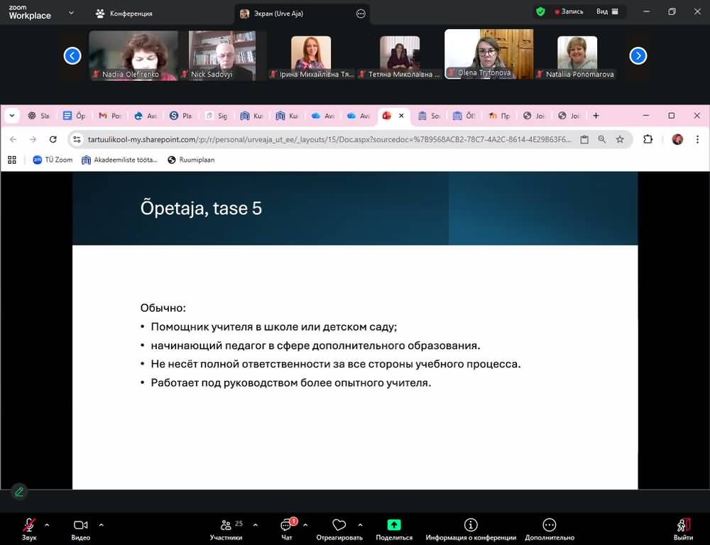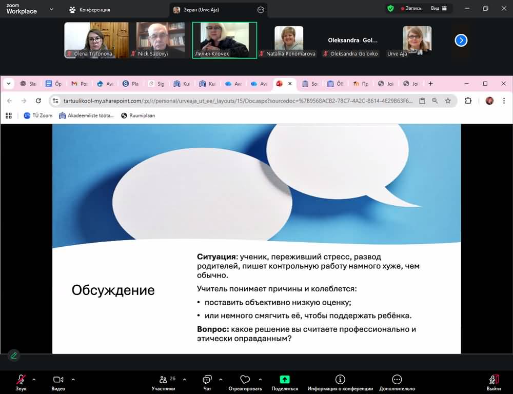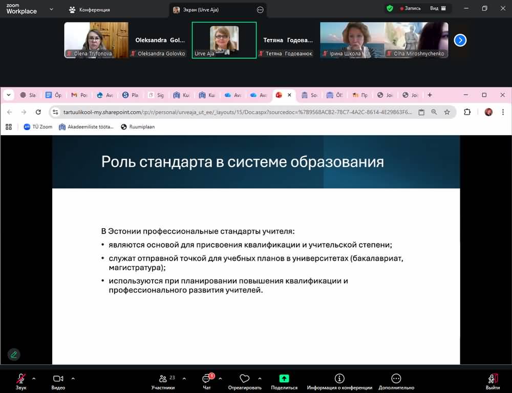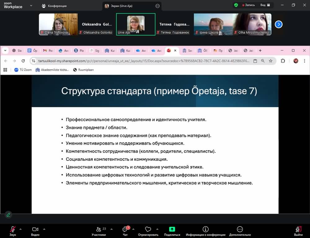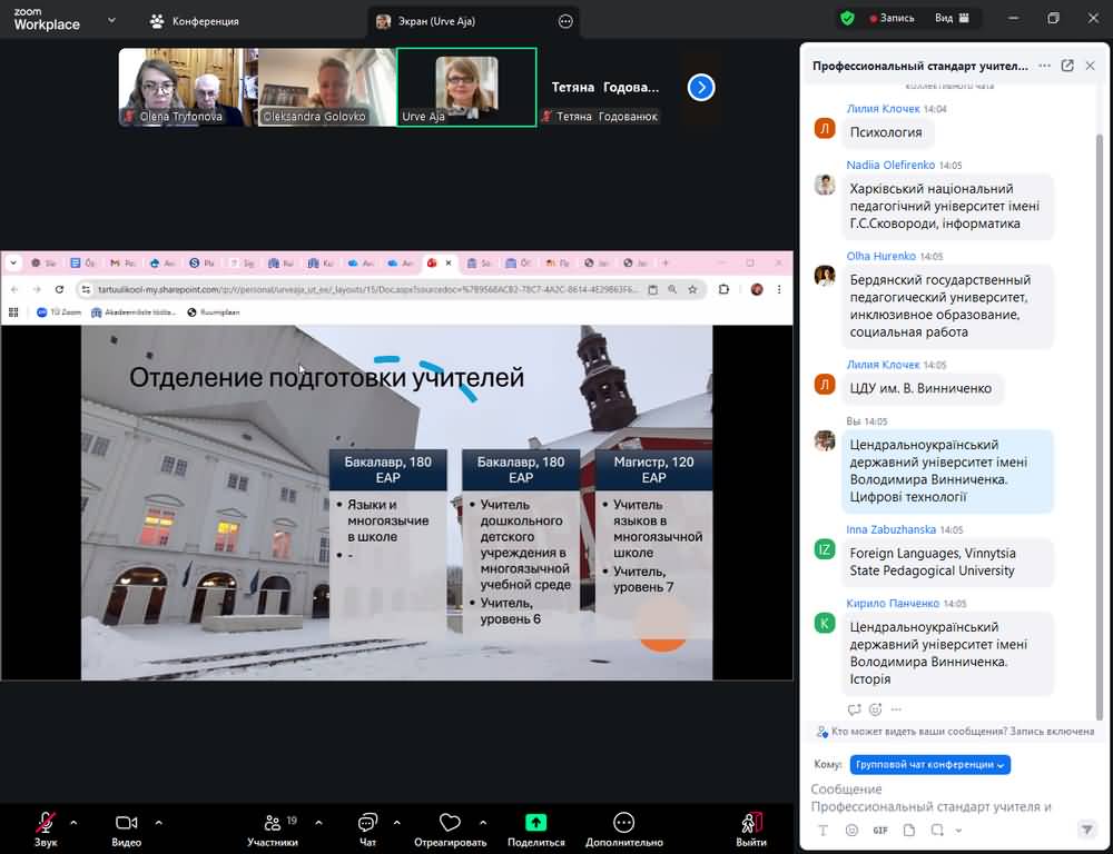 26 листопада 2025 року відбулася чергова сесія, присвячена темі «Професійний стандарт вчителя та професійна етика педагога». Лектором виступила Urve Aja, PhD, завідуюча відділом підготовки вчителів Нарвського коледжу Тартуського університету (Естонія).