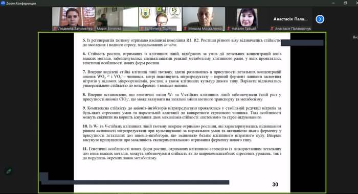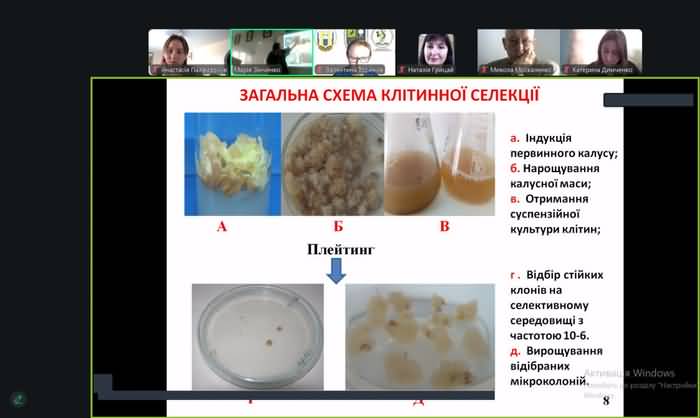 Лекція присвячена ефективності клітинної селекції для підвищення стійкості рослин тютюну до абіотичних стресів. Під час лекції авторка презентувала мету, об’єкт, предмет хід та результати дослідження. Варто зауважити на науковій новизні одержаних результатів, а саме: вперше запропонована ідея застосування клітинної селекції з використанням летальних доз ІВМ для отримання форм рослин із комплексною стійкістю до іонних та осмотичних стресів. Результати проведено дослідження засвідчили, що, що відбір клітин, толерантних до іонів важких металів, індукує перехресну стійкість до водно-сольового стресу; нащадки (R1 покоління) селектованих ліній демонструють значно краще проростання у стресових умовах порівняно з контролем і ця стійкість є успадковуваною і реалізується через фізіологічні механізми, пов'язані, зокрема, з регуляцією активності ферменту нітратредуктази. Це підтверджує перспективність методу для виведення нових стресостійких сортів як до широкомасштабних стресових уражень, так і до порушень окремих ланок метаболізму.