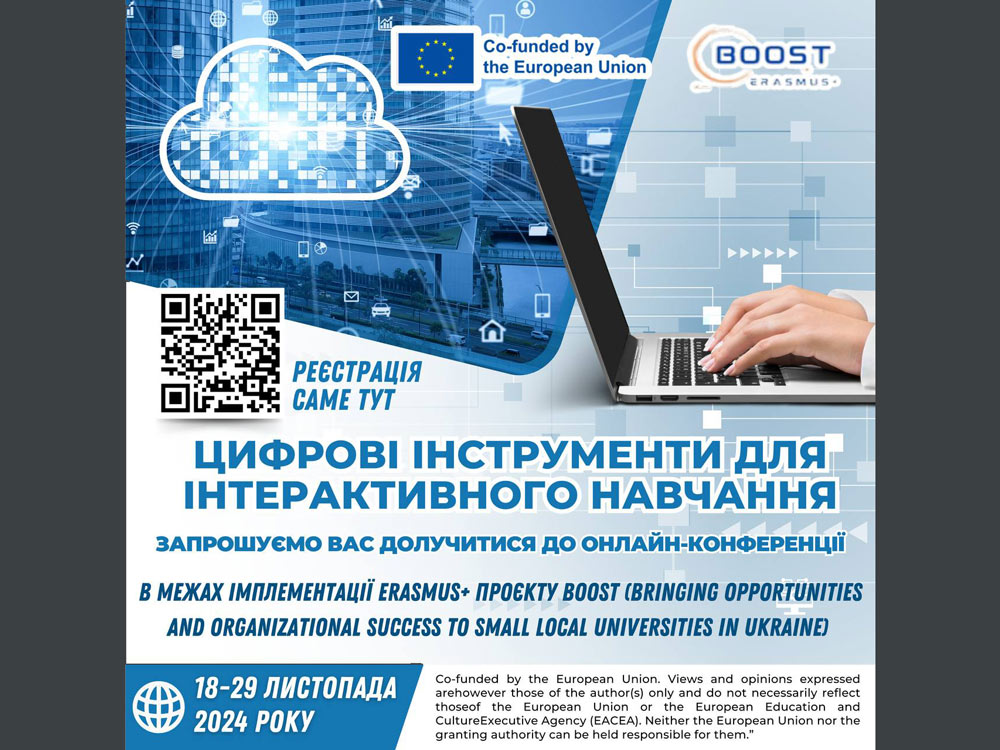 Викладачі кафедри інформатики, програмування, штучного інтелекту та технологічної освіти О. Абрамова, Л. Ганенко, О. Пуляк, О. Рєзіна, С. Рябець, С. Шлянчак, Т. Шлапак активно долучилися до роботи практичної конференції «ЦИФРОВІ ІНСТРУМЕНТИ ДЛЯ ІНТЕРАКТИВНОГО НАВЧАННЯ», організованої в межах реалізації Erasmus+ проєкту BOOST (Bringing Opportunities and Organizational Success To Small Local Universities in Ukraine).