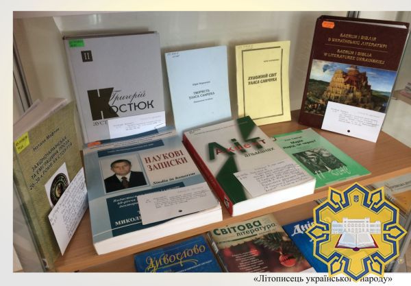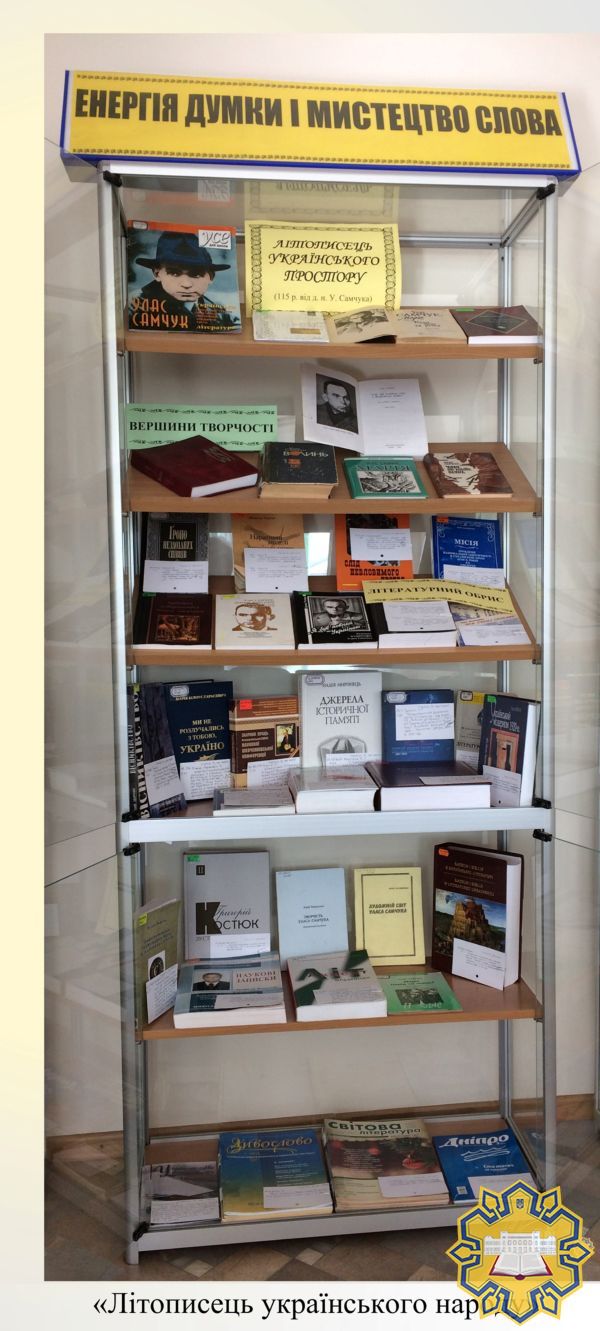 Книжкова виставка, яка експонується в читальному залі філологічних дисциплін з 19 лютого, присвячена нелегкому життєвому і творчому шляху українського Гомера ХХ століття Уласу Самчуку. Донедавна творчий доробок письменника був під забороною й лише знедавна його твори повертаються до шанувальників української прози.