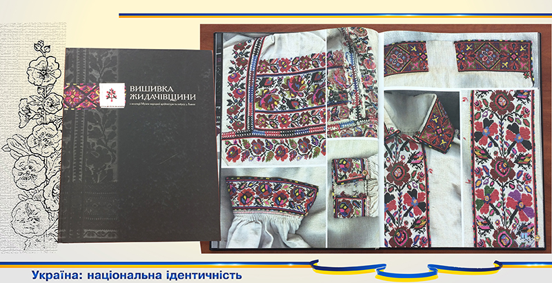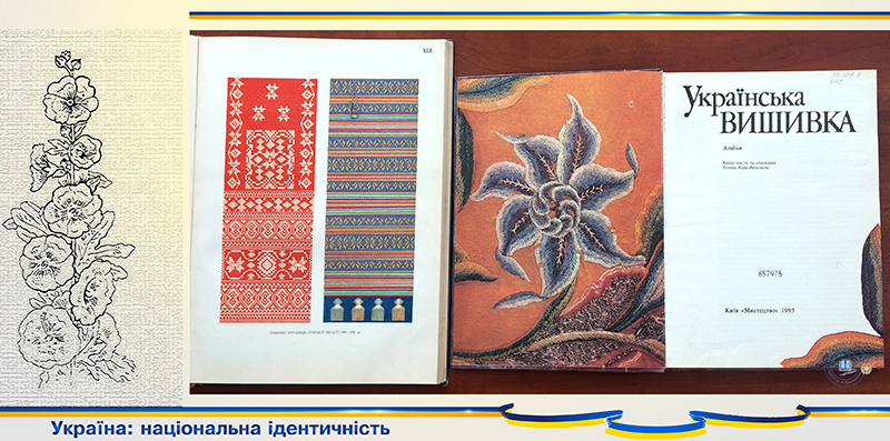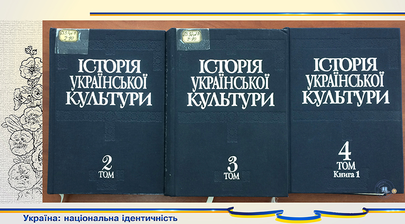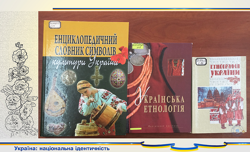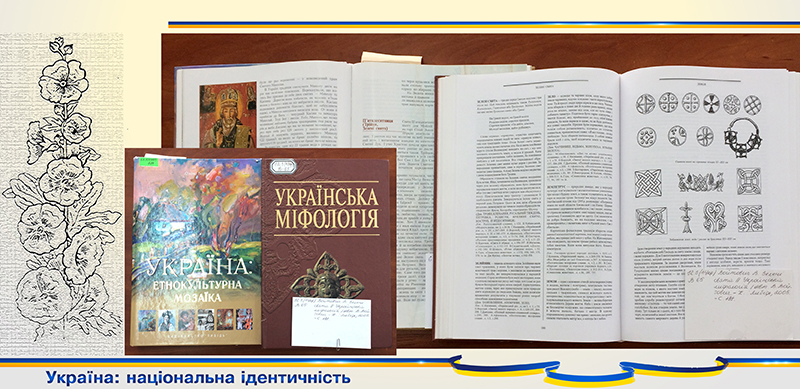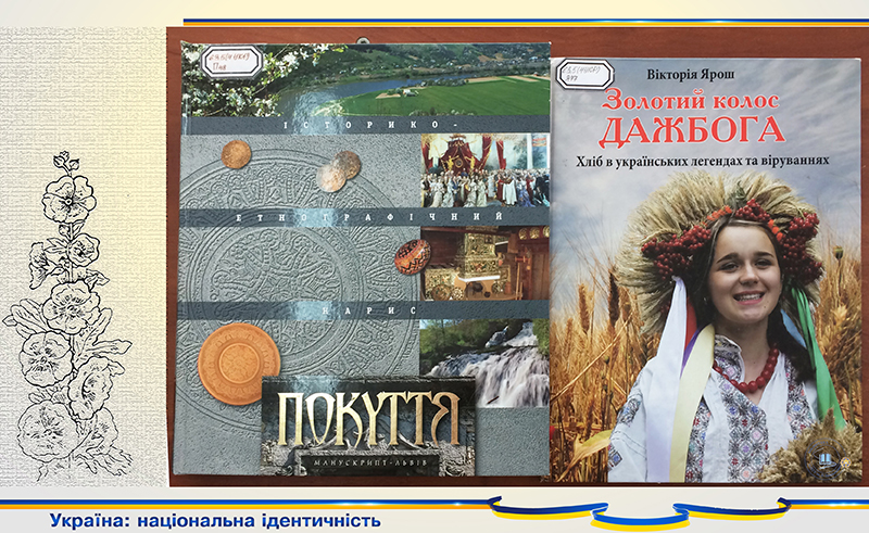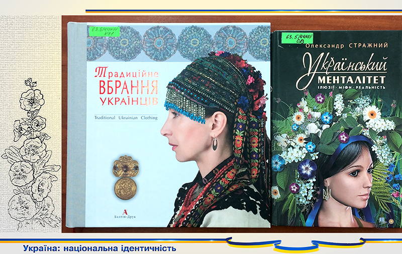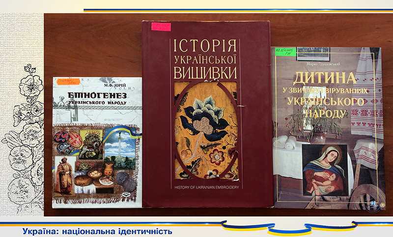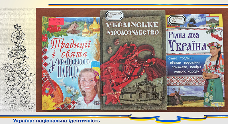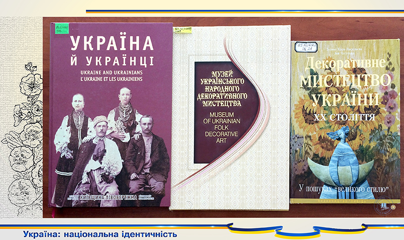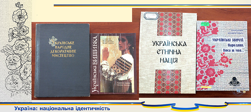 Перший розділ тематичної експозиції «Україна: національна ідентичність» знайомить читачів із національною культурою, яка є унікальною і самобутньою та ґрунтується на витоках народності. Адже творцем української національної культури є український народ, який створив її упродовж багатьох століть, що знайшло відображення у моральних цінностях, святинях, національній символіці, у традиціях, звичаях та обрядах.