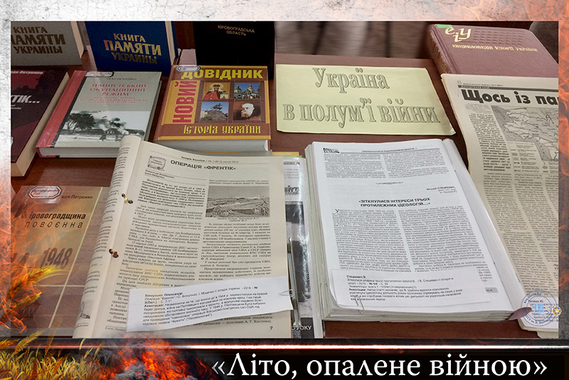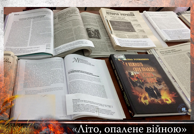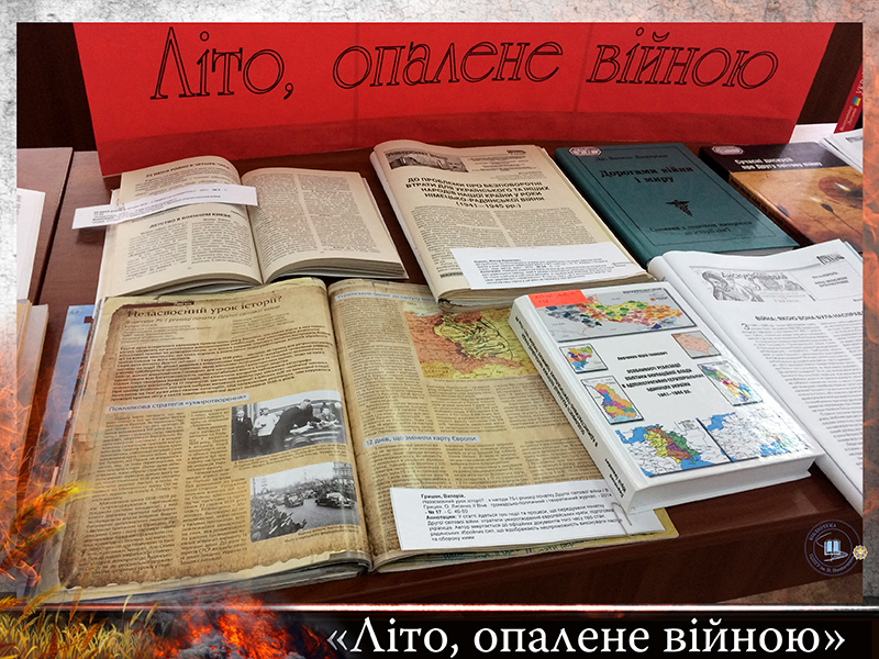 22 червня 1941 року гітлерівські війська підступно і без попередження розпочали війну на українській землі. Цей день став для України Днем глибокої скорботи. Бібліотекарі універсального читального залу підготували книжкову ілюстровану виставку «Літо, опалене війною», яка розкриває увесь трагізм, що пережили українці.