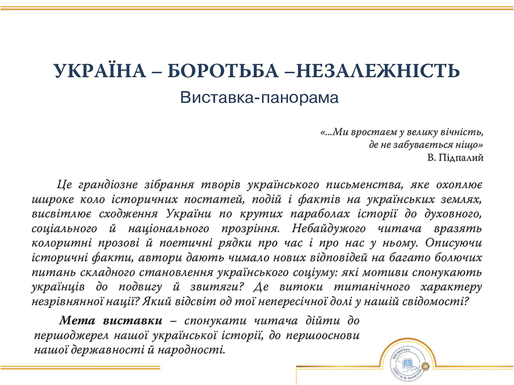 Мета виставки – спонукати читача дійти до першоджерел нашої української історії, до першооснови нашої державності й народності.