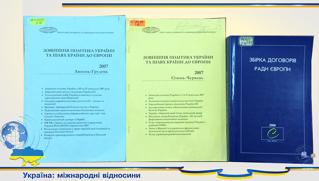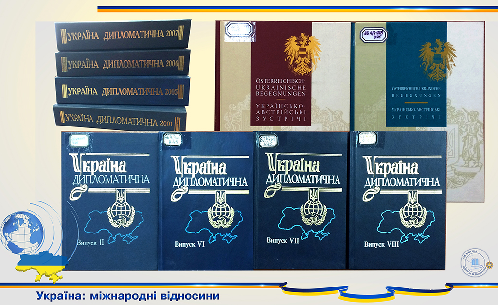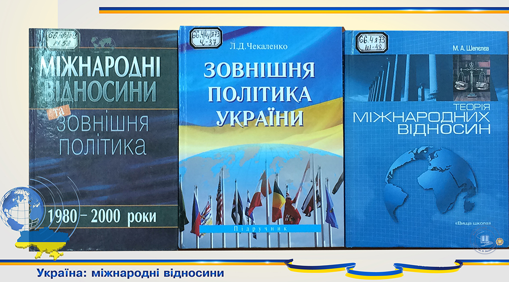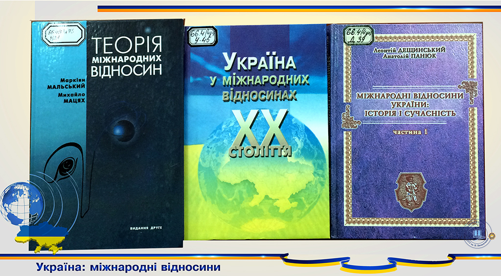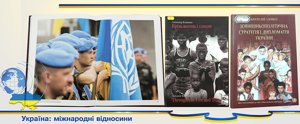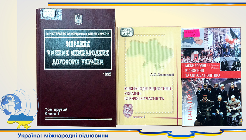 В рамках святкування 30-річчя Незалежності України співробітники бібліотеки продовжують цикл тематичних виставок. Вашій увазі представлено наступну рубрику «Україна – міжнародні відносини», яка акцентує на таких аспектах зовнішньополітичної діяльності нашої держави, як укладання міжнародних договорів, вектори зовнішньої політики, участь України в міжнародних організаціях (ООН, Парламентська асамблея Ради Європи), миротворчих операціях. Також на виставці представлені збірники документі, історія дипломатії та міжнародних відносин, дипломатичні енциклопедії, монографії, навчальні посібники.