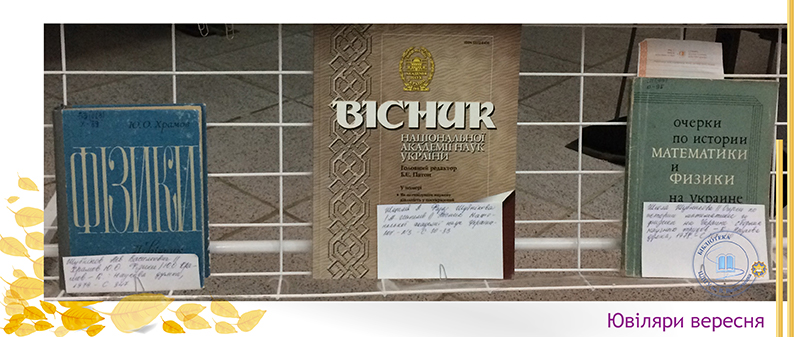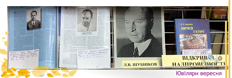 Вересень щедрий на ювілеї видатних учених, які зробили вагомий внесок у розвиток фізико-математичних наук. Це – М. Фарадей, М. В. Остроградський, Е. Фермі, Л. В. Шубников. До уваги читачів бібліотекарями абонементу № 2 запропонована виставка “Видатні діячі науки”. Вони — дослідники різних країн, великі подвижники від науки, праці яких ще довго залишатимуться не почесними архівними експонатами, а дієвим інструментом пізнання закономірностей природи.