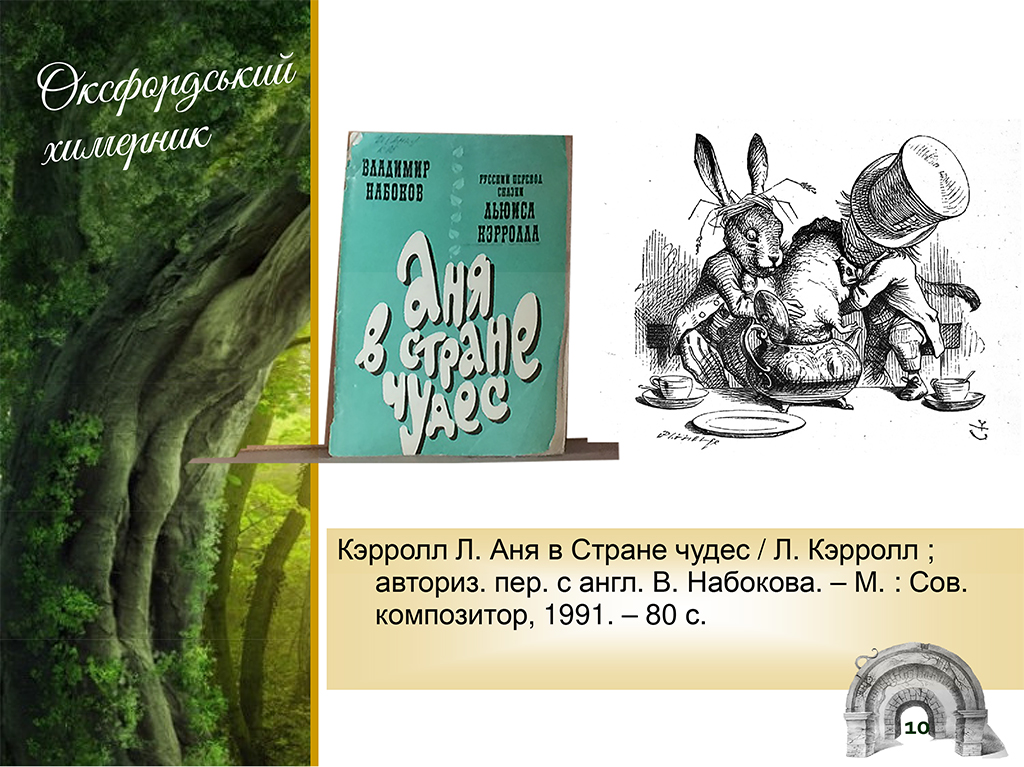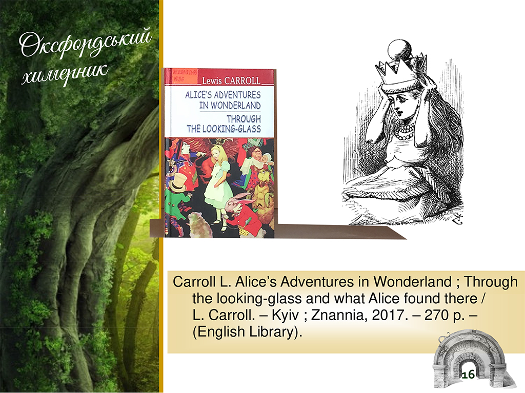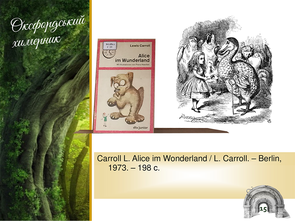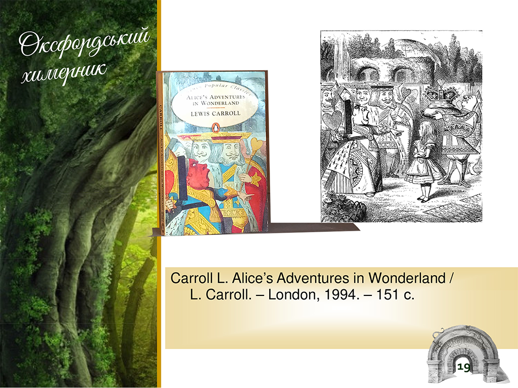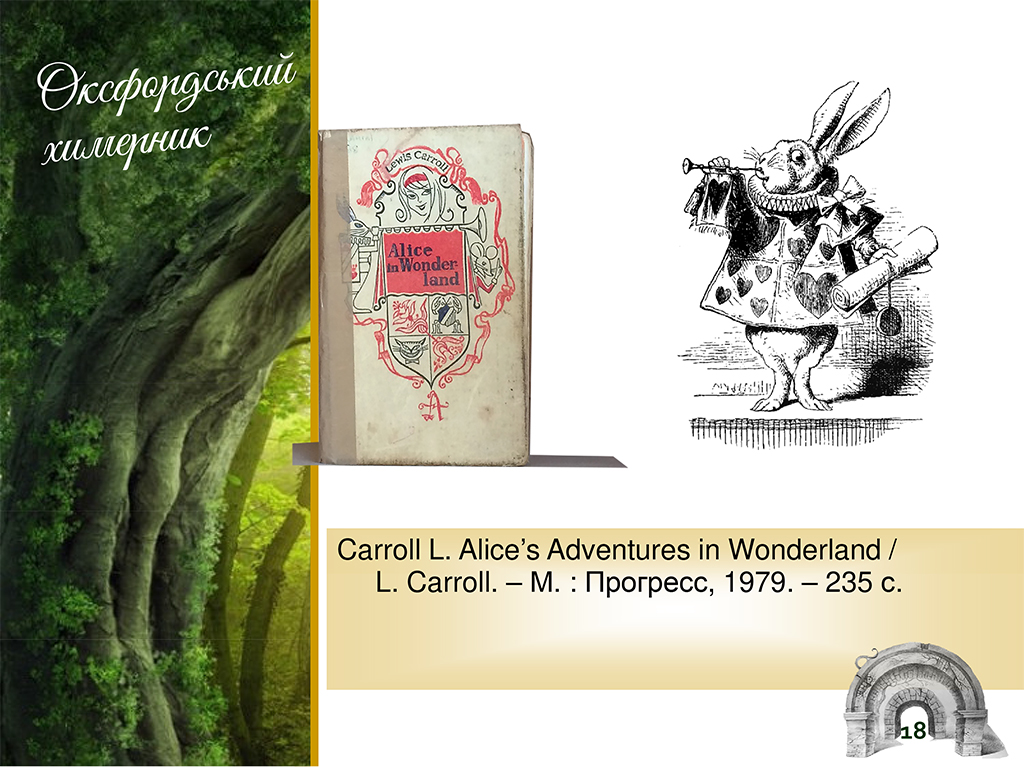 Кількість й різноманіття видань вершинного твору Льюїса Керролла, – вперше зібрані з загального фонду бібліотеки, – здивує й захопить навіть книжкових гурманів, на яких чекають видання мовою оригіналу.