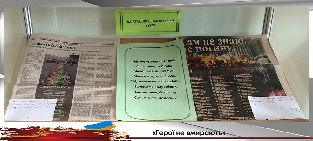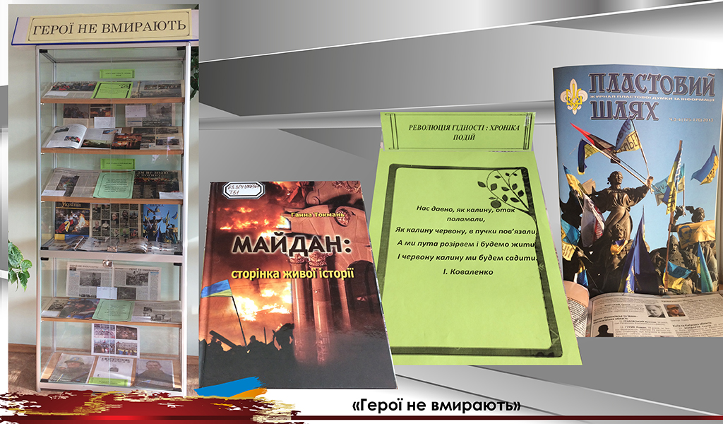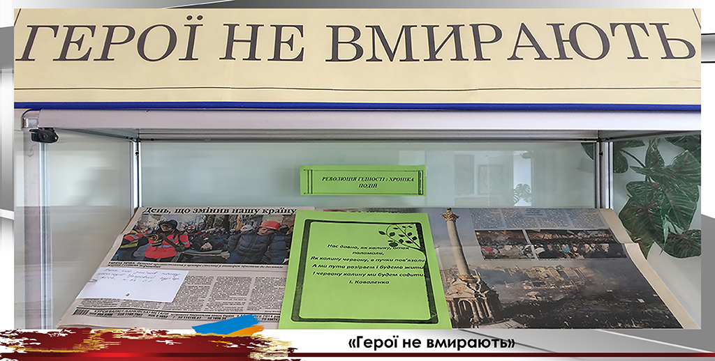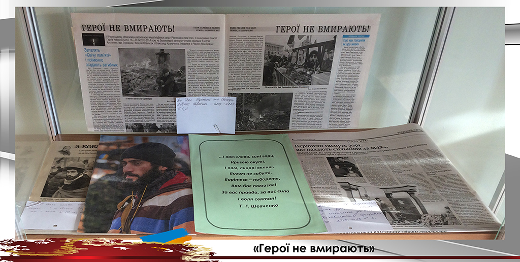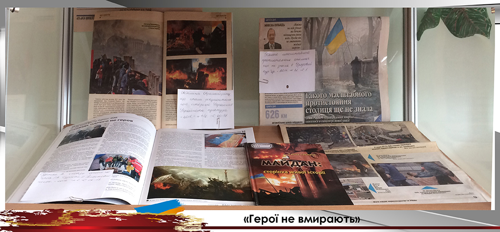 До Дня вшанування пам’яті Героїв Небесної Сотні універсальний читальний зал підготував виставку «Герої не вмирають». Цією виставкою ми вшановуємо подвиг учасників Революції Гідності, які поклали життя за волю України, за свободу та гідне життя свого народу. Цих героїв назвали Небесною Сотнею.