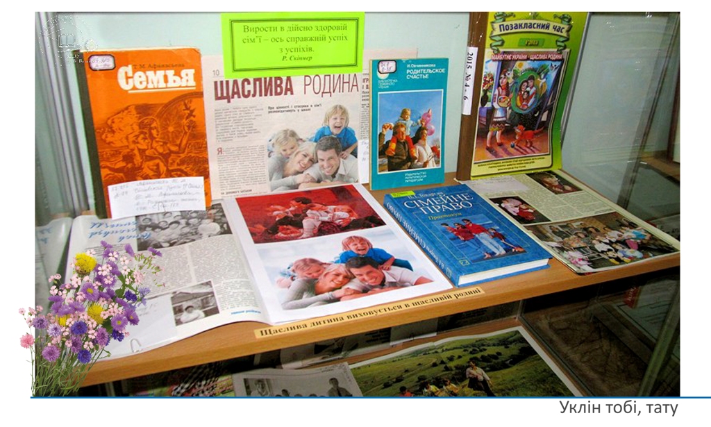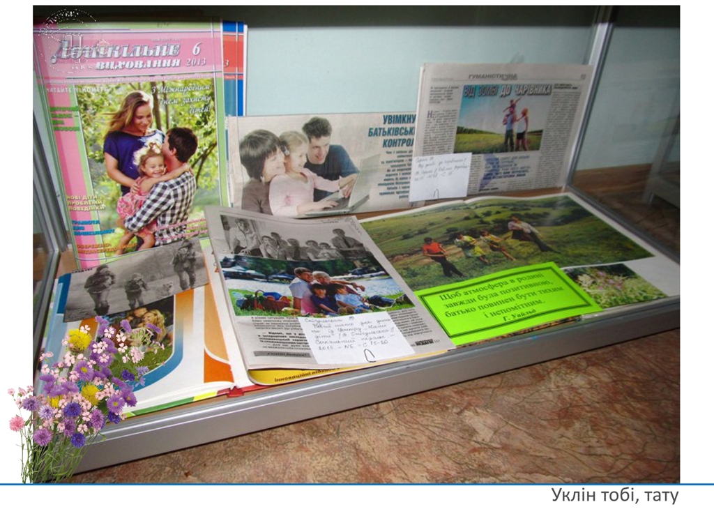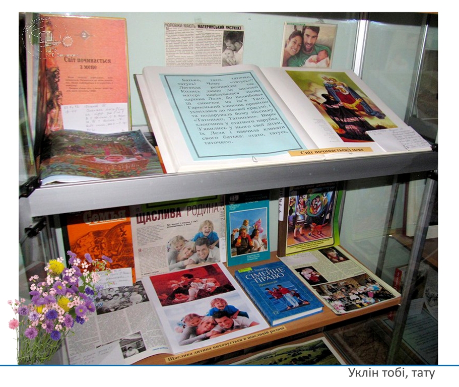 До Дня батька універсальний читальний зал бібліотеки КДПУ ім. В. Винниченка приурочує розгорнуту книжкову виставку «Уклін тобі, тату». В Україні вже котрий рік відзначається свято Матері, нарешті до нього додається неабиякий ще день – День батька, другої найріднішої для дитини людини, а інколи і людини, яка в одній особі втілює і маму, і тата. Саме люблячому батькові, другу, пораднику присвячується цей матеріал виставки. До Вашої уваги книги та періодичні видання, що розкривають безмежні можливості батька, татову любов – мов океан.