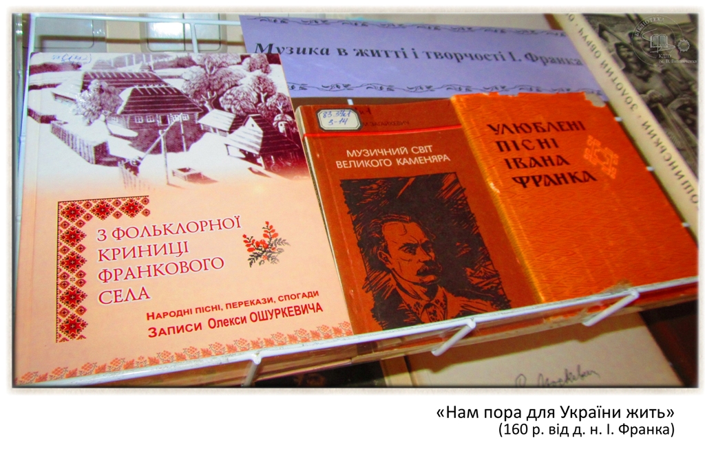 Творчий доробок Івана Франка та статті, промови, виступи, спогади українських письменників про нього складають основу виставки. Також експозиція вміщує DVD-Rдиск «Імена з Оксаною Марченко», який присвячений митцю. Цівковою для читачів буде рубрика «Музика в житті і творчості І. Франка», яка ознайомить з клавірами пісень, романсів і опер українських композиторів на слова письменника.