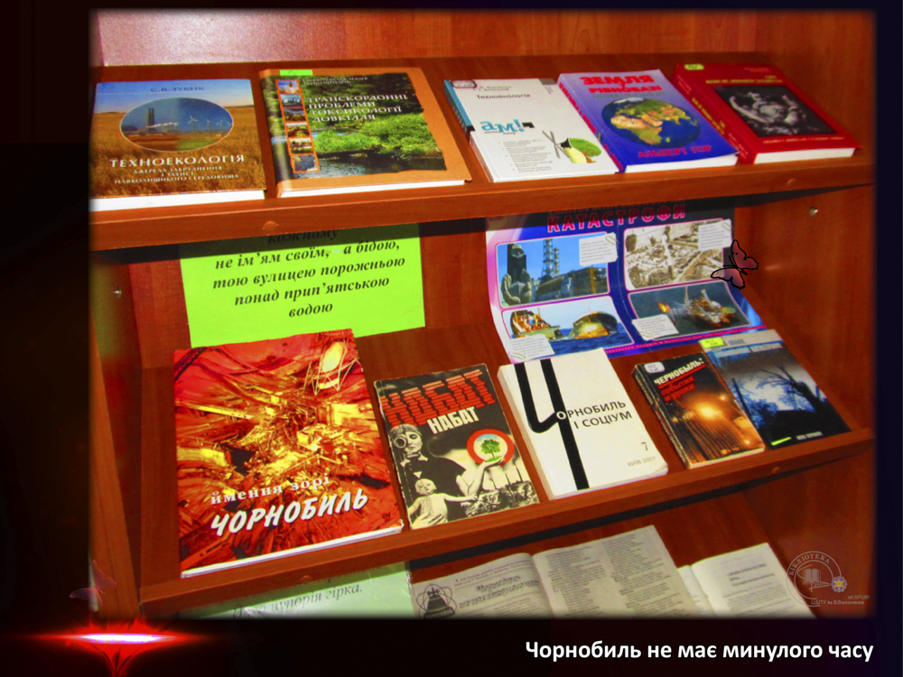 Бібліотека природничо-географічного факультету висвітлює реалії сьогодення: вплив людини на довкілля, забруднення навколишнього середовища, від чого втрачається природна рівновага. Про атомну електростанцію, аварію на ній та техногенну катастрофу, спричинену вибухом реактора, читач може довідатись з книг та статей Кірімова І. «Звізда Полин, або Запланована катастрофа», Сафанова Ю. «Біль і тривоги Чорнобиля», Борисова О. «Проект «Уроки Чорнобиля», Хрієнка М. «Похід через атомний полюс: нотатки подорожнього», Фесенка С. «Чорнобиля гіркий полин на серце ліг незримо й тяжко…» та ін.
