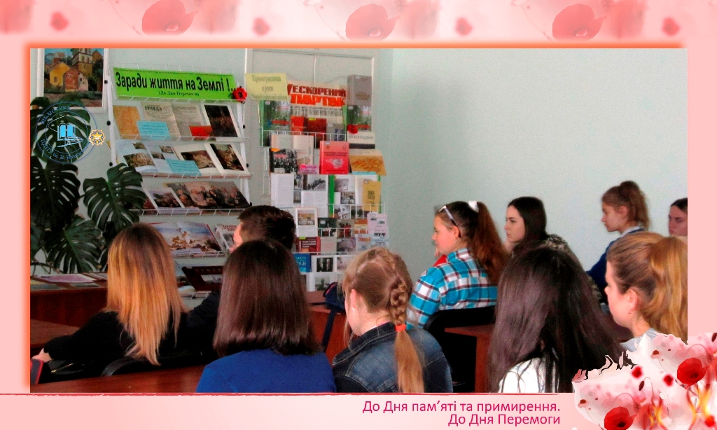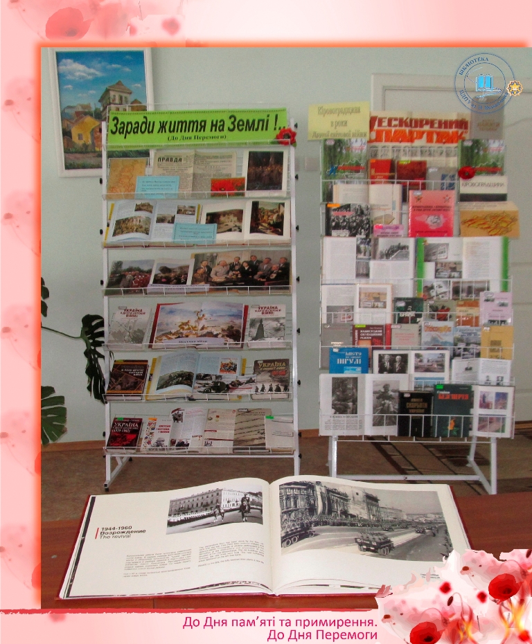 З нагоди Дня пам’яті і примирення та Дня Перемоги над нацизмом у Другій світовій війні бібліотека Кіровоградського державного педагогічного університету імені В. Винниченка присвятила низку заходів. Бібліотекарі читальних залів та абонементів для учнів ліцею провели розгорнутий огляд книжкових виставок: «День пам’яті і примирення», «Заради життя на Землі», «Кіровоградщина у роки Другої світової війни», «Слово і подвиг».