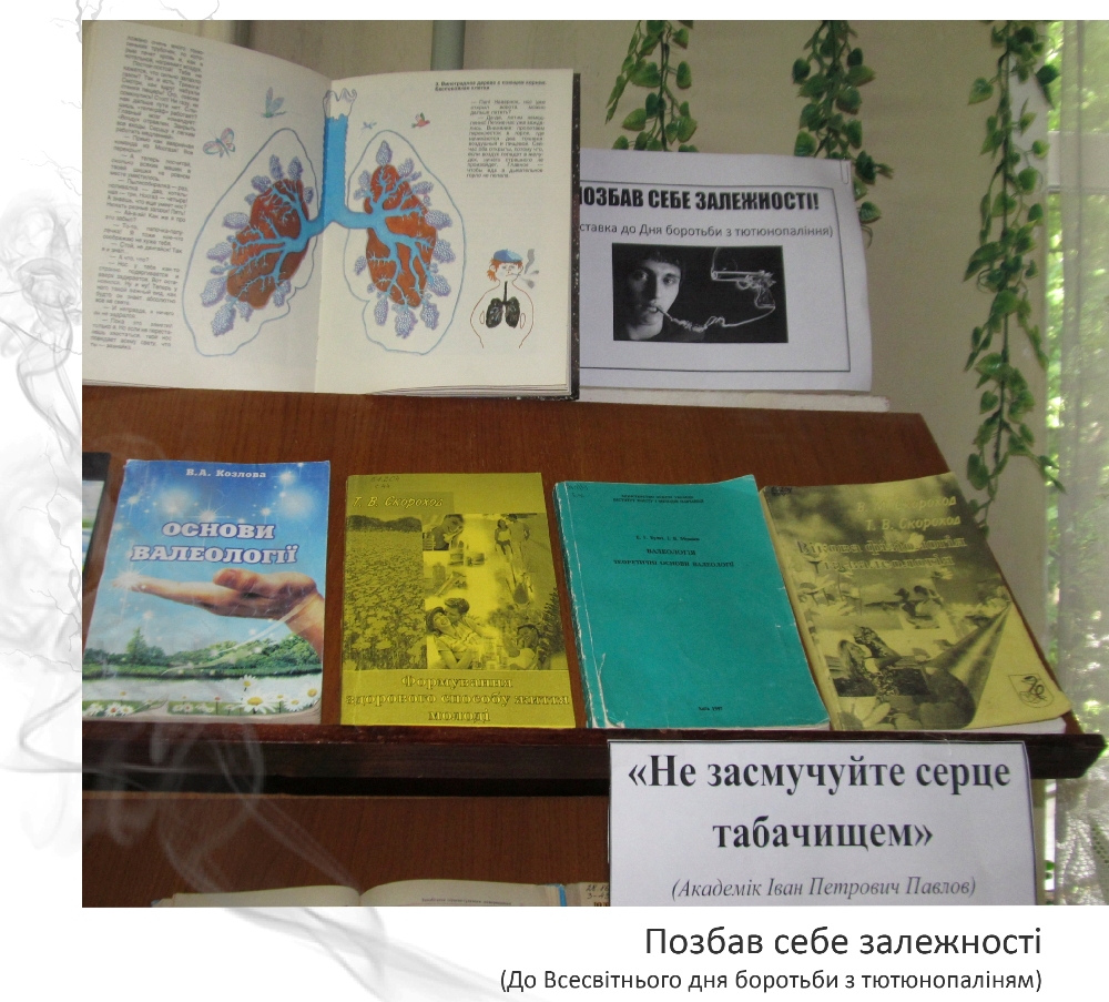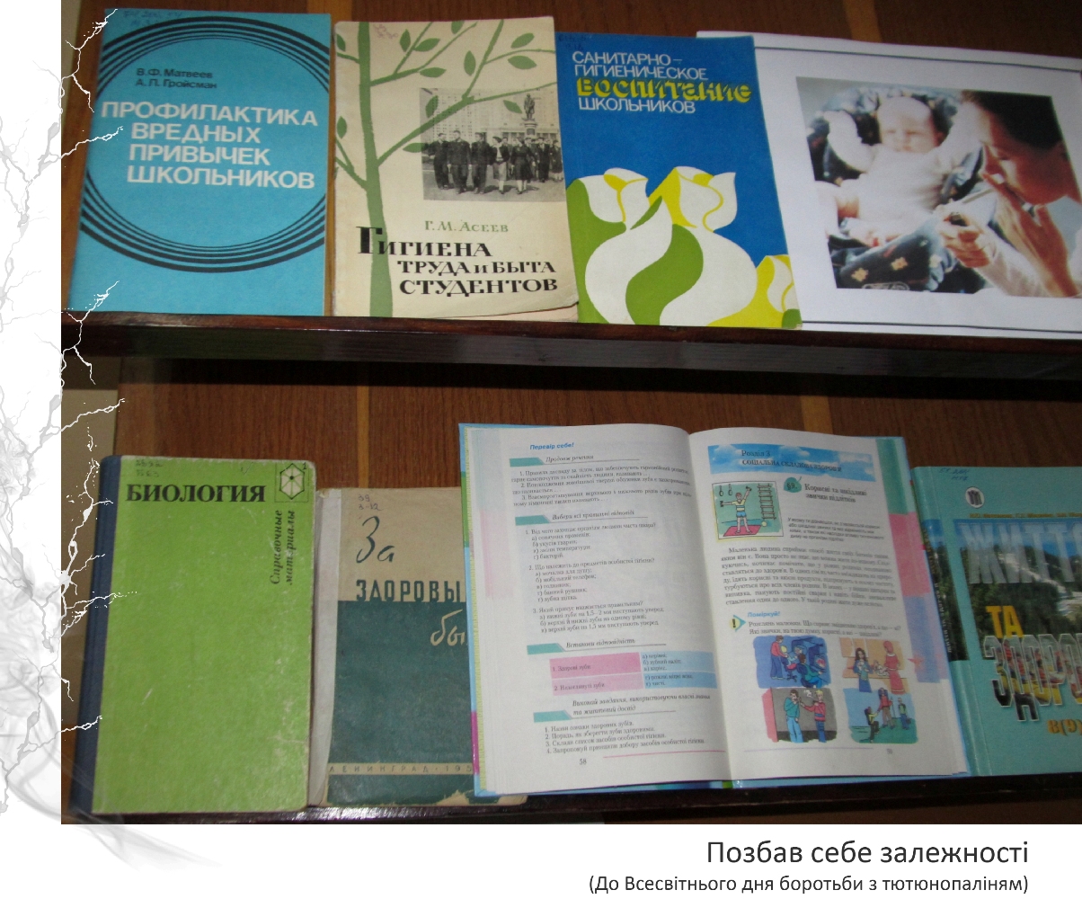 Куріння, як різновид небезпечної токсикоманії, та форми роботи з «хімічно залежними» родинами розглянуті у навчальному посібнику з педагогічної психології К.В. Сідих, В. Ф. Моргун «Делінкветний підліток». Про методи «захисної педагогіки» у вихованні школярів та систему розумних застережень від шкідливих звичок у дітей можна дізнатися зі статті В.О.Сухомлинського «Як любити дітей». На виставці розміщена також література, направлена на формування в учнів негативного іміджу курця та переконання, що палити вже не модно: «Воспитание здорового школьника» Н.Б. Коростильова, «Формування здорового способу життя» В.М. Скороход, Т.В. Скороход. Про невиправні зміни в організмі майбутнього малюка під час паління вагітної жінки йдеться в підручниках В.А. Козлової «Основи валеології» та В.М.Скороход, Т.В. Скороход «Вікова фізіологія та валеологія».
