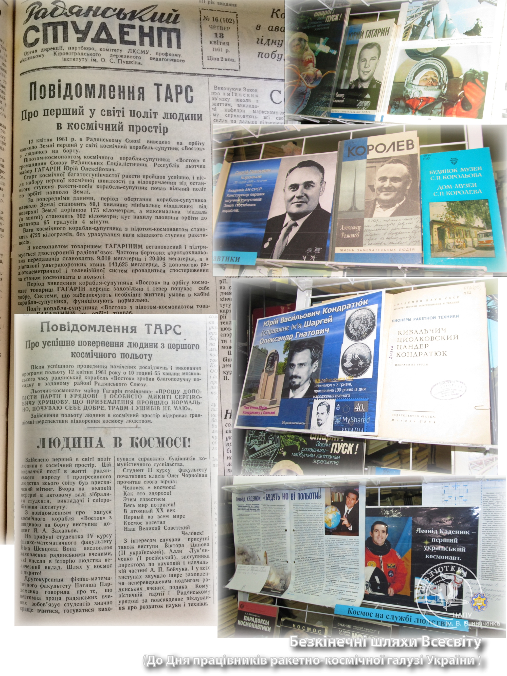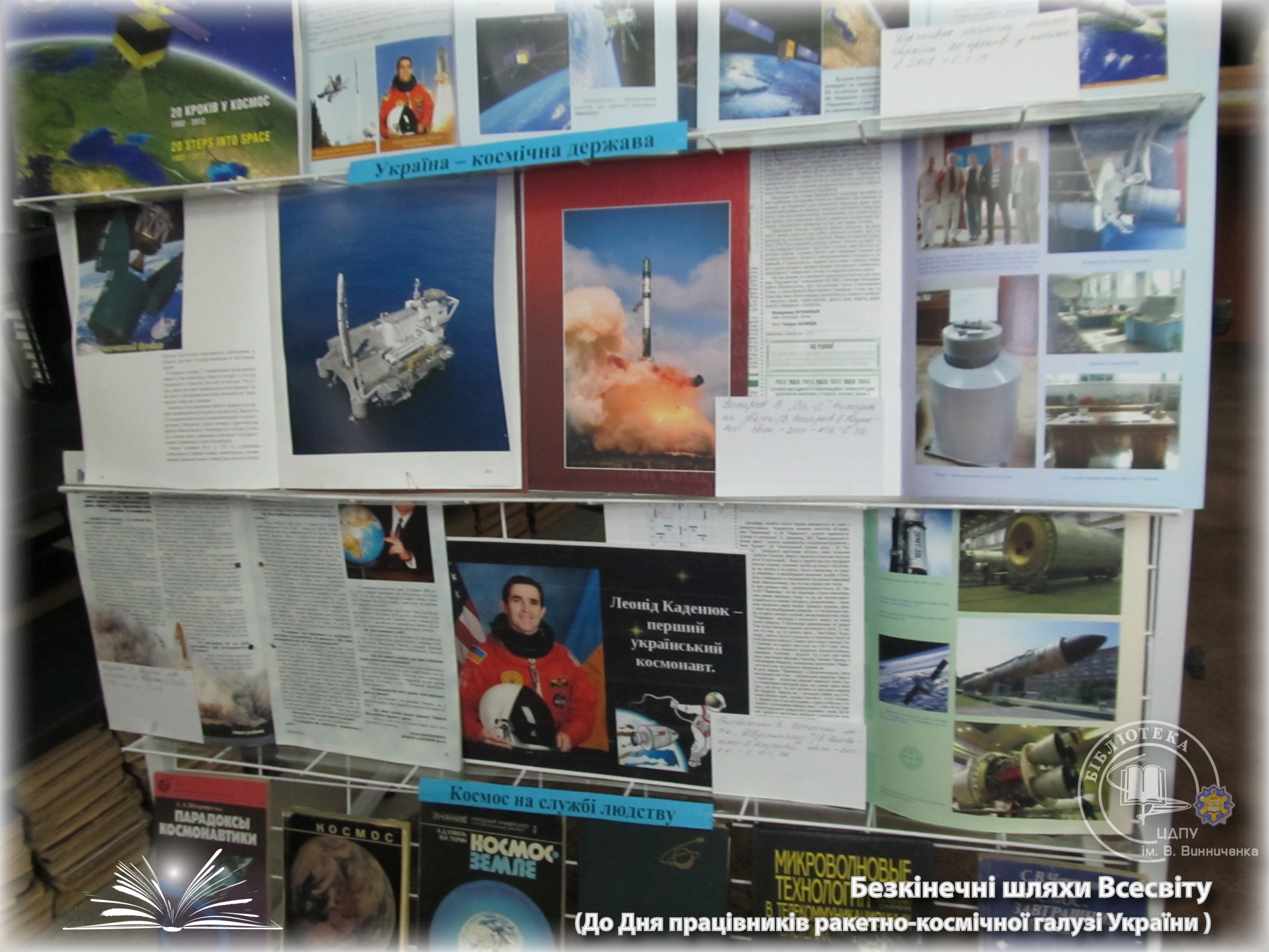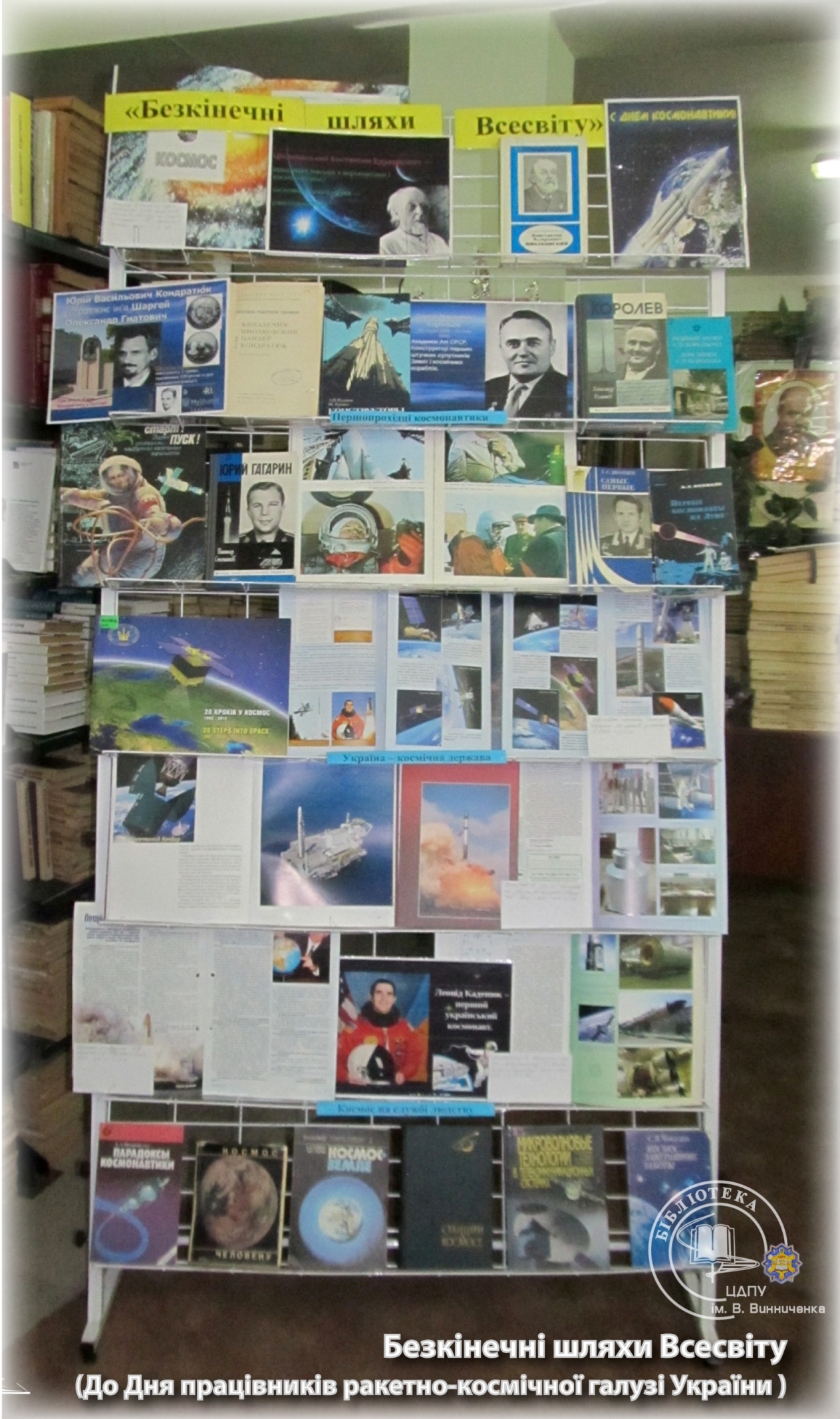 В Україні 12 квітня відзначається як День працівників ракетно-космічної галузі України. До цього свята на абонементі № 2 експонується виставка «Безкінечні шляхи Всесвіту». Імена героїв рубрики «Першопрохідці космосу» – К. Е. Ціолковського, Ю. В. Кондратюка, М. К. Янгеля, В. Г. Глушко, С. П. Корольова – знає увесь світ. Іх самовіддана праця, відданість вибраній професії зробили реальністю мрію людини про космічні польоти. Українці давно змусили увесь світ шанувати наш «космічний» потенціал. Наші науковці змінювали історію своїми винаходами, а численні космонавти безстрашно виконували місію землян у Всесвіті. Українець був першим, хто додумався використати ракети для польоту людини в космос, під керівництвом нашого земляка створено пілотовані космічні кораблі, на яких вперше в історії людина вирушила в космічний політ.
