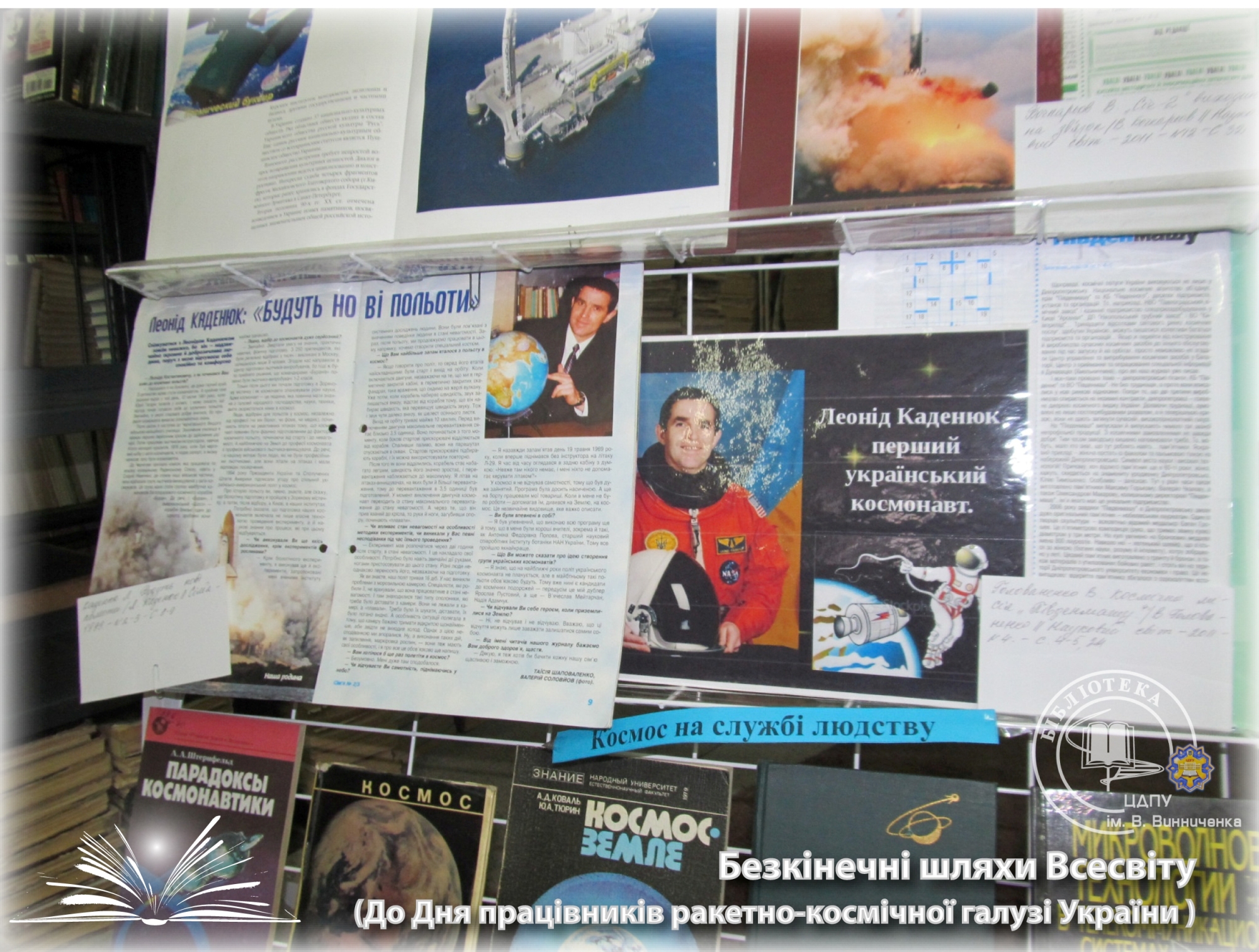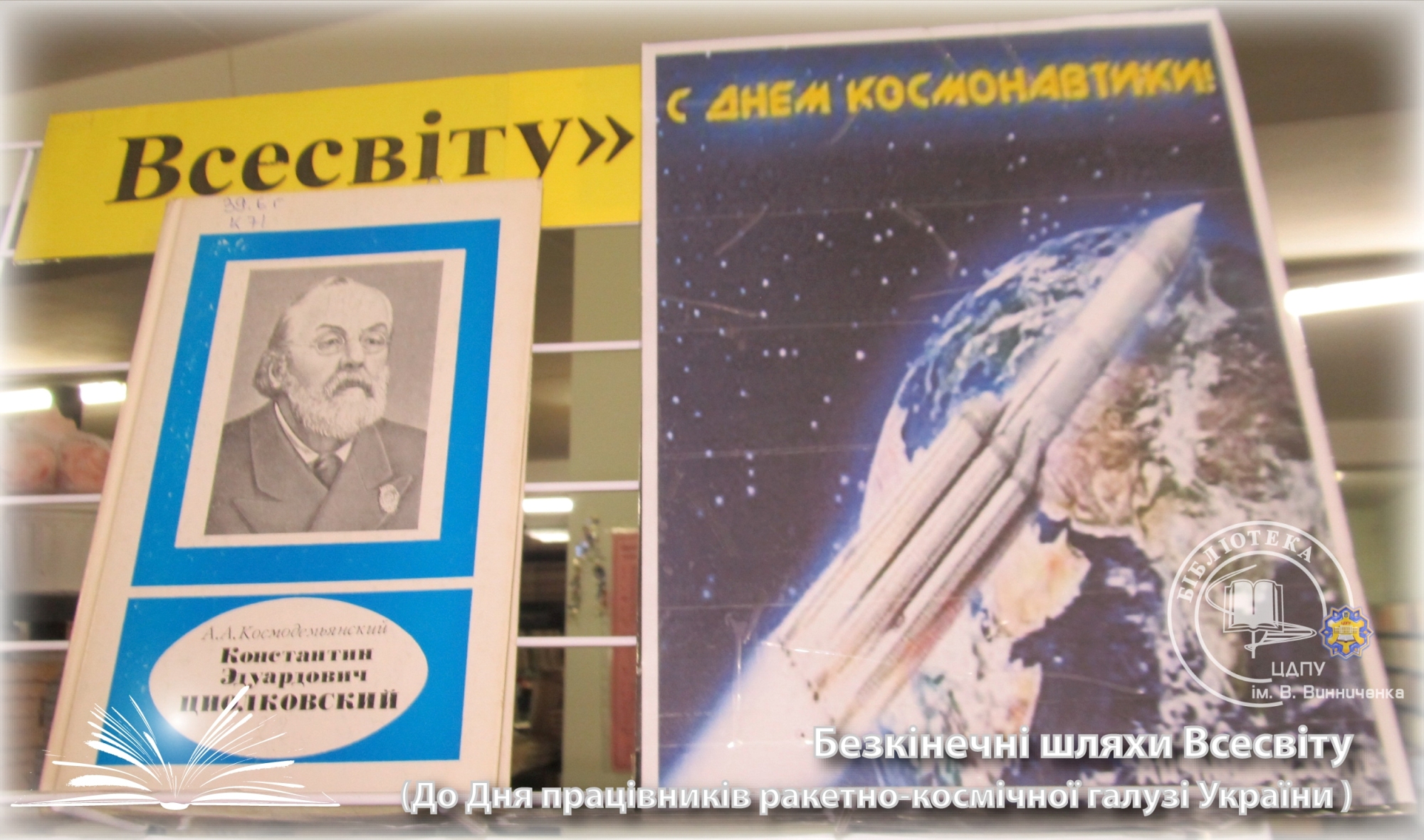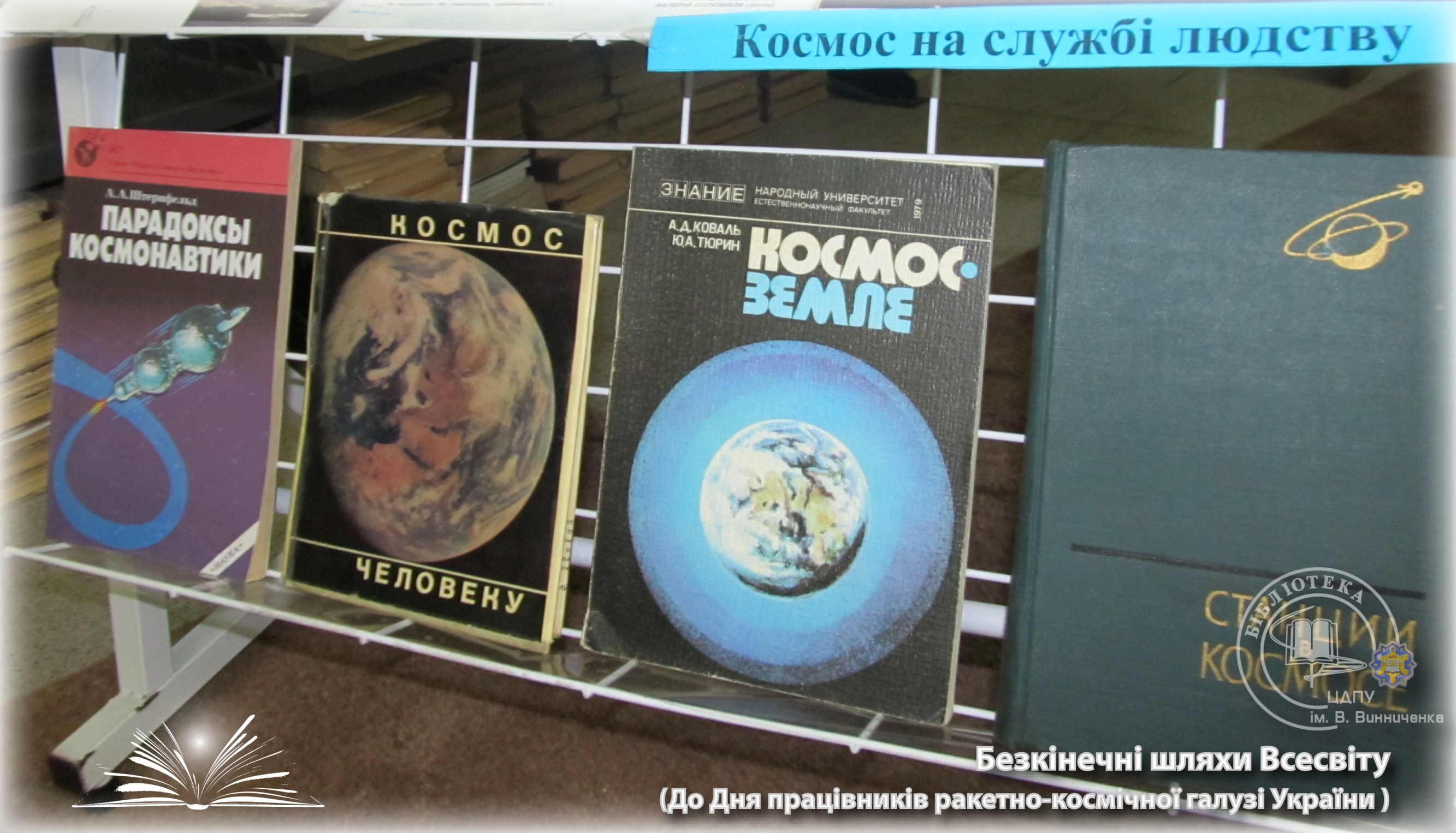В Україні 12 квітня відзначається як День працівників ракетно-космічної галузі України. До цього свята на абонементі № 2 експонується виставка «Безкінечні шляхи Всесвіту». Імена героїв рубрики «Першопрохідці космосу» – К. Е. Ціолковського, Ю. В. Кондратюка, М. К. Янгеля, В. Г. Глушко, С. П. Корольова – знає увесь світ. Іх самовіддана праця, відданість вибраній професії зробили реальністю мрію людини про космічні польоти. Українці давно змусили увесь світ шанувати наш «космічний» потенціал. Наші науковці змінювали історію своїми винаходами, а численні космонавти безстрашно виконували місію землян у Всесвіті. Українець був першим, хто додумався використати ракети для польоту людини в космос, під керівництвом нашого земляка створено пілотовані космічні кораблі, на яких вперше в історії людина вирушила в космічний політ.