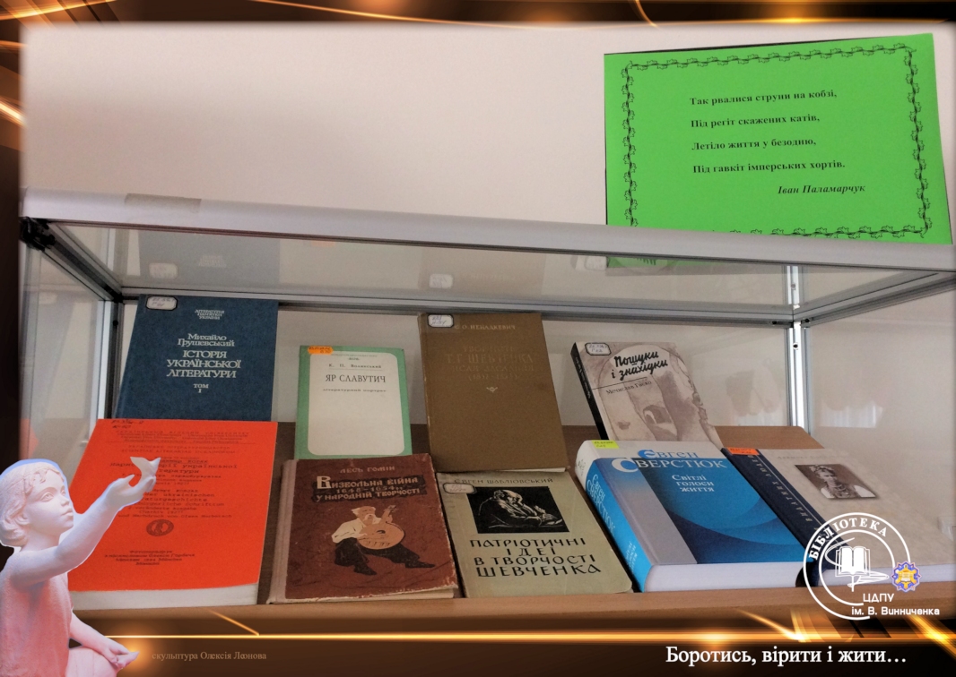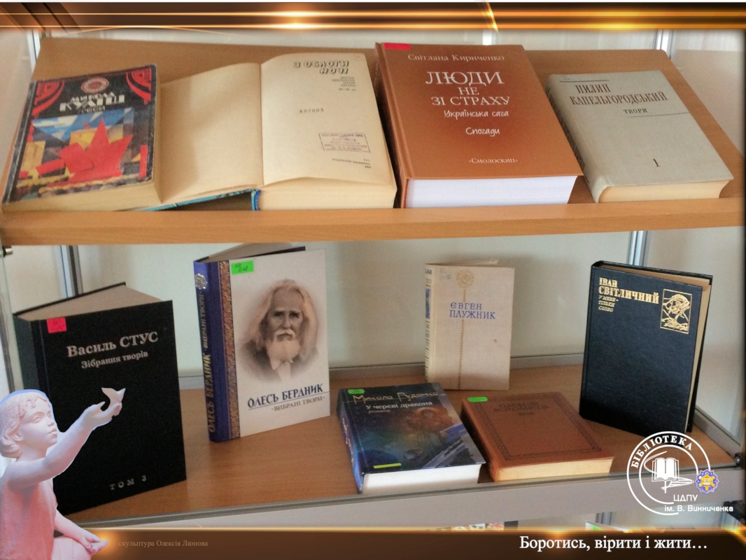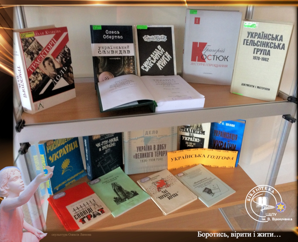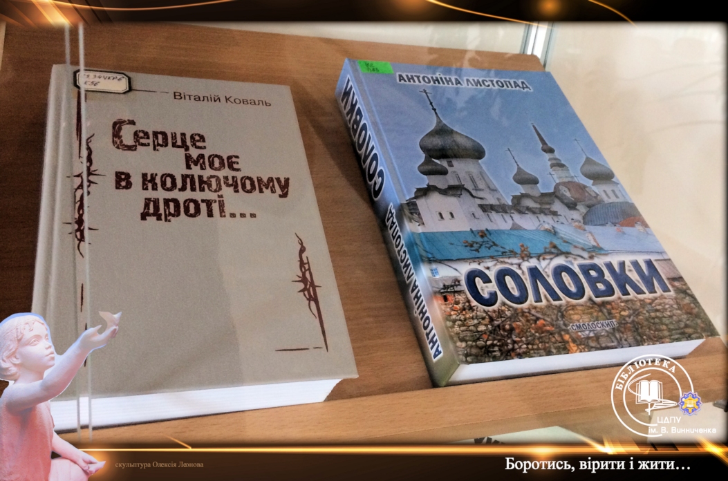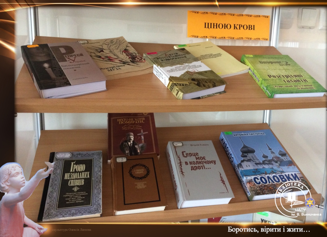 В читальному залі для науковців з 1 вересня експонується тематична виставка на підтримку українських політв’язнів на теренах Росії. Шановні читачі! Експозицію варто переглянути всім, щоб пригадати минуле, яким болючим воно не було б, та йти до майбутнього з пам’яттю про втрати! Це виставка-реквієм за красним українським письменством. Кожен третій бранець таборів на російських Соловках – УКРАЇНЕЦЬ!