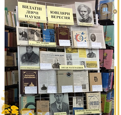 Вересень щедрий на ювілеї видатних учених, які зробили вагомий внесок у розвиток фізико-математичних наук. Це – М. Фарадей, М. В. Остроградський, Е. Фермі, Л. В. Шубников. До уваги читачів бібліотекарями абонементу № 2 запропонована виставка “Видатні діячі науки”. Вони — дослідники різних країн, великі подвижники від науки, праці яких ще довго залишатимуться не почесними архівними експонатами, а дієвим інструментом пізнання закономірностей природи.