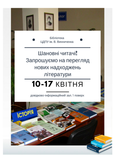 Місце проведення: довідково-інформаційний зал, 1 поверх головного приміщення бібліотеки ЦДПУ ім. В. Винниченка.