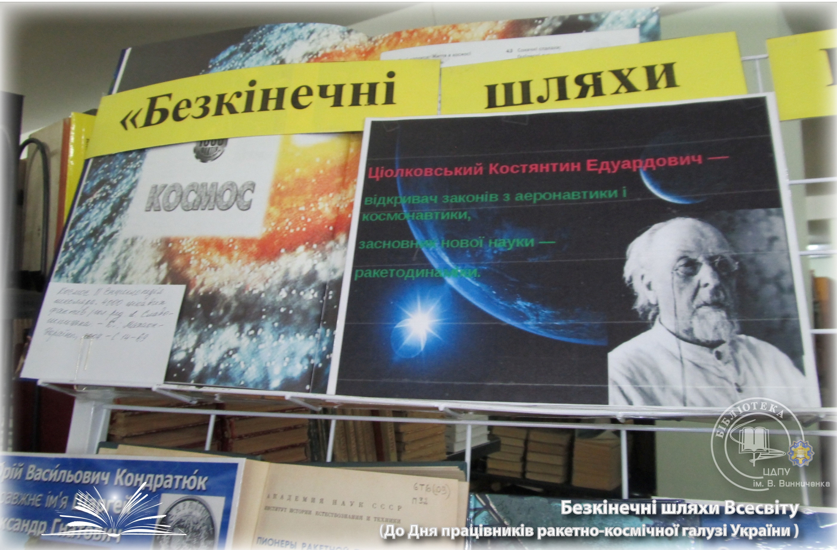 В Україні 12 квітня відзначається як День працівників ракетно-космічної галузі України. До цього свята на абонементі № 2 експонується виставка «Безкінечні шляхи Всесвіту». Імена героїв рубрики «Першопрохідці космосу» – К. Е. Ціолковського, Ю. В. Кондратюка, М. К. Янгеля, В. Г. Глушко, С. П. Корольова – знає увесь світ. Іх самовіддана праця, відданість вибраній професії зробили реальністю мрію людини про космічні польоти. Українці давно змусили увесь світ шанувати наш «космічний» потенціал. Наші науковці змінювали історію своїми винаходами, а численні космонавти безстрашно виконували місію землян у Всесвіті. Українець був першим, хто додумався використати ракети для польоту людини в космос, під керівництвом нашого земляка створено пілотовані космічні кораблі, на яких вперше в історії людина вирушила в космічний політ.