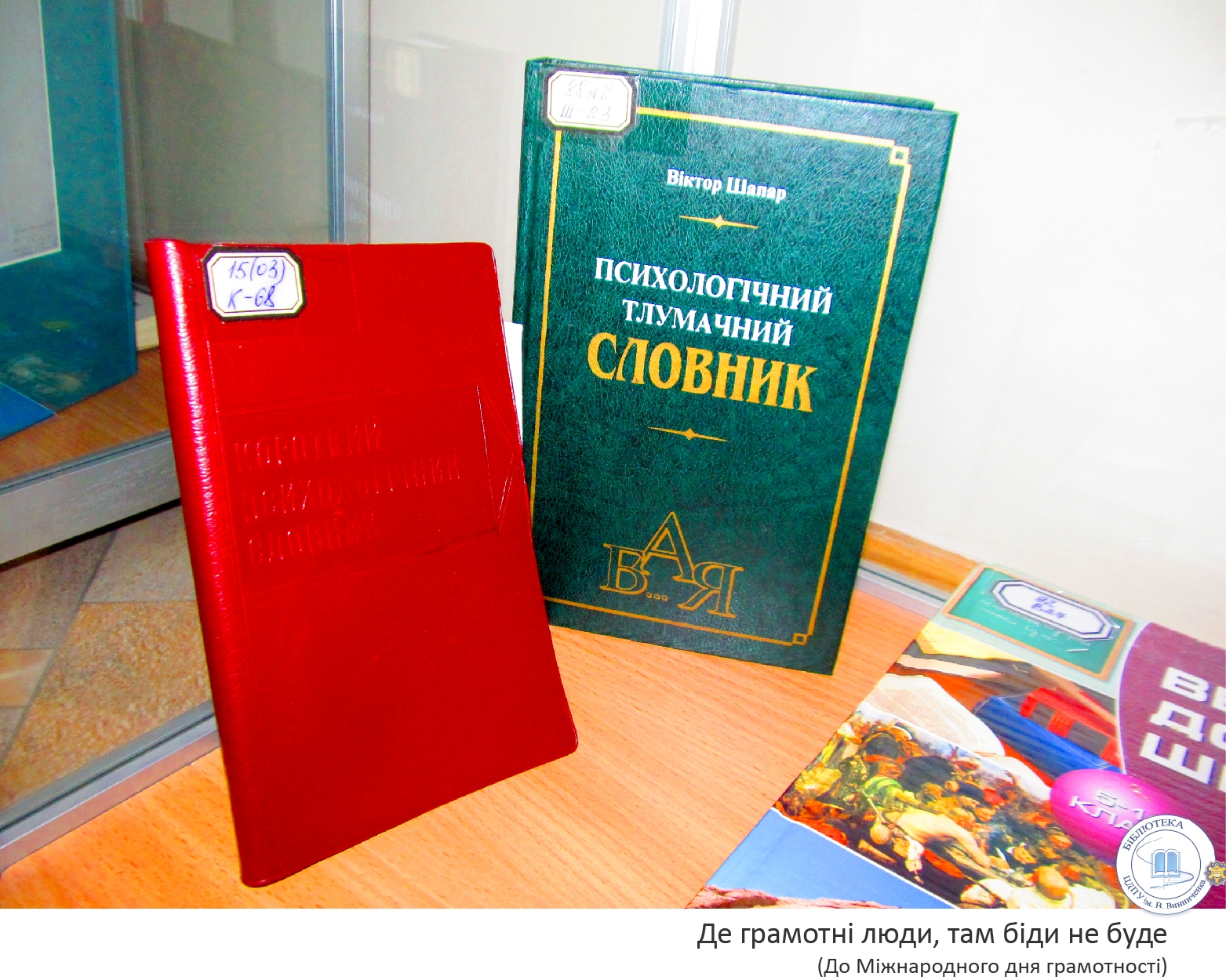 До уваги читачів читального залу філологічних дисциплін пропонується книжкова виставка, присвячена Міжнародному дню грамотності. Це свято офіційно відзначається 8 вересня Організацією Об’єднаних Націй. Запропонована виставка дає змогу відвідувачам знайти необхідні їм довідкові матеріали, до їхньої уваги підібрані словники з різних галузей знань, а для допитливих читачів, тих, чия професійна діяльність пов'язана зі спілкуванням, це є важливою умовою успіху.
