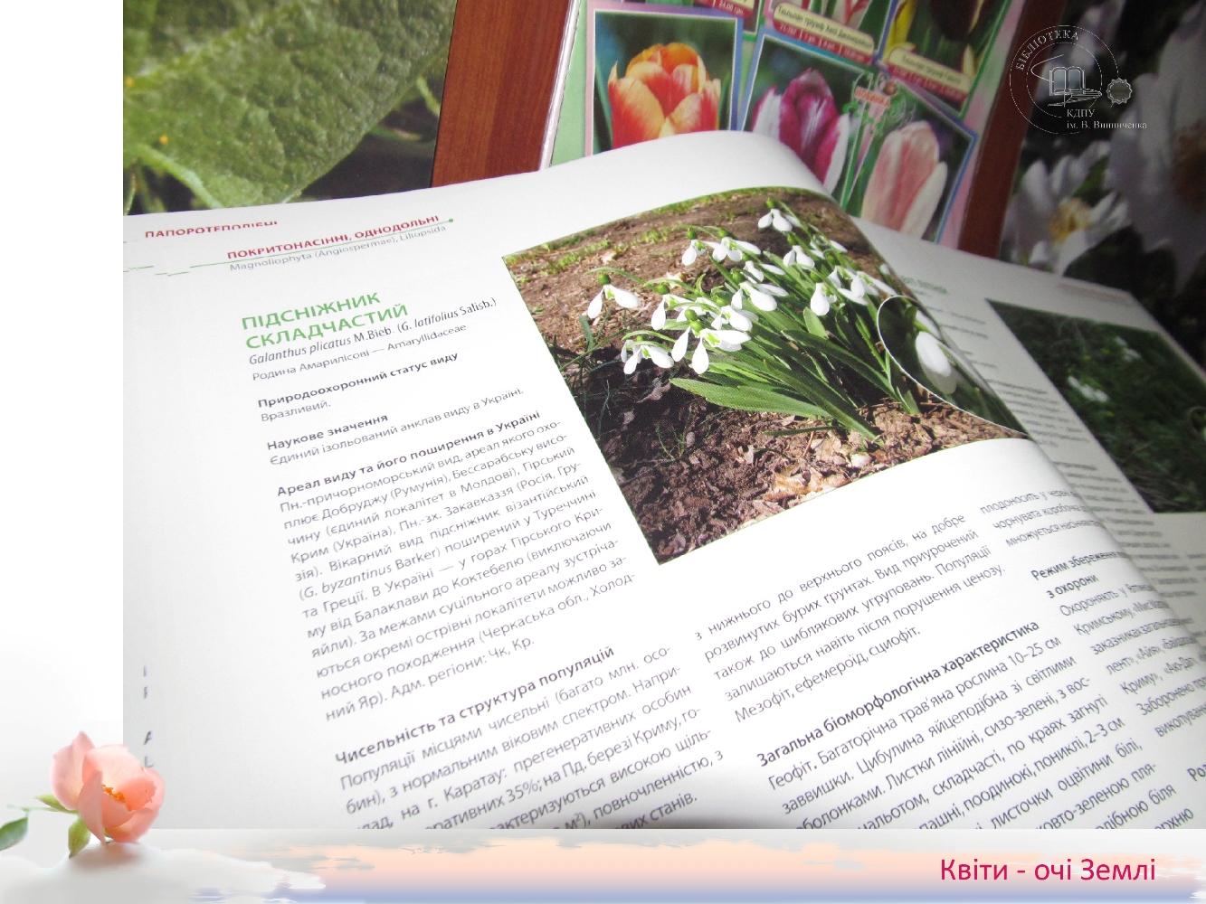 У читальному залі бібліотеки природничо-географічного факультету організована книжково-ілюстративна виставка до Всесвітнього дня квітів. Це свято відзначають жителі багатьох країн світу. Жодне свято не обходиться без квітів, адже вони є окрасою нашого життя, частинкою всієї живої зеленої природи. Всі ми з нетерпінням чекаємо прихід величавої і чарівної весни, яка дивує нас своїми барвами.