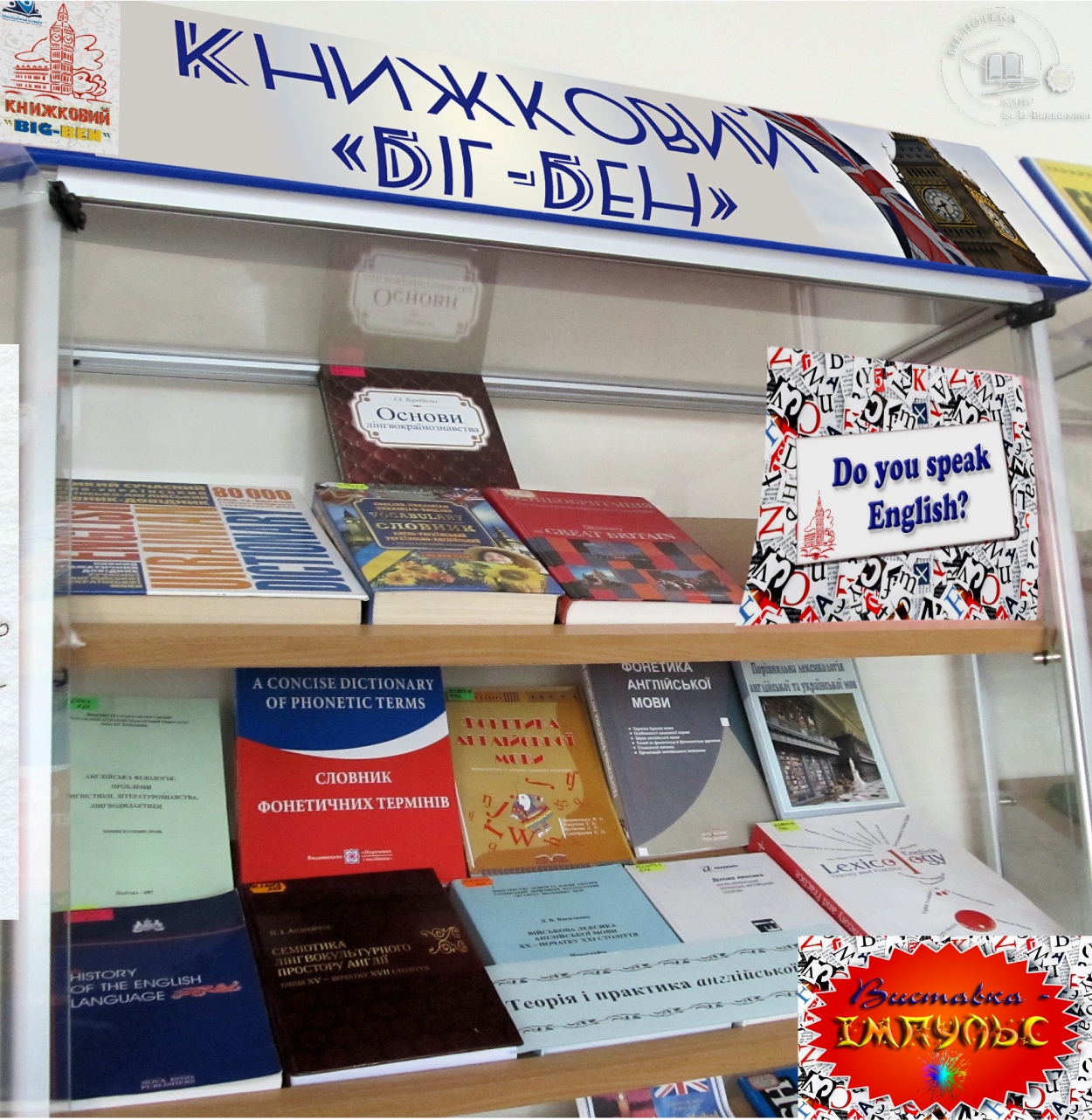 Шановні читачі! З нагоди Року англійської мови в Україні до вашої уваги пропонується тематична імпульс-виставка «Книжковий Біг Бен», яка експонується в читальному залі філологічних дисциплін бібліотеки університету. Експозиція спрямована на популяризацію вивчення англійської мови серед молоді. Знання англійської мови забезпечує доступ до світових освітніх і культурних можливостей.