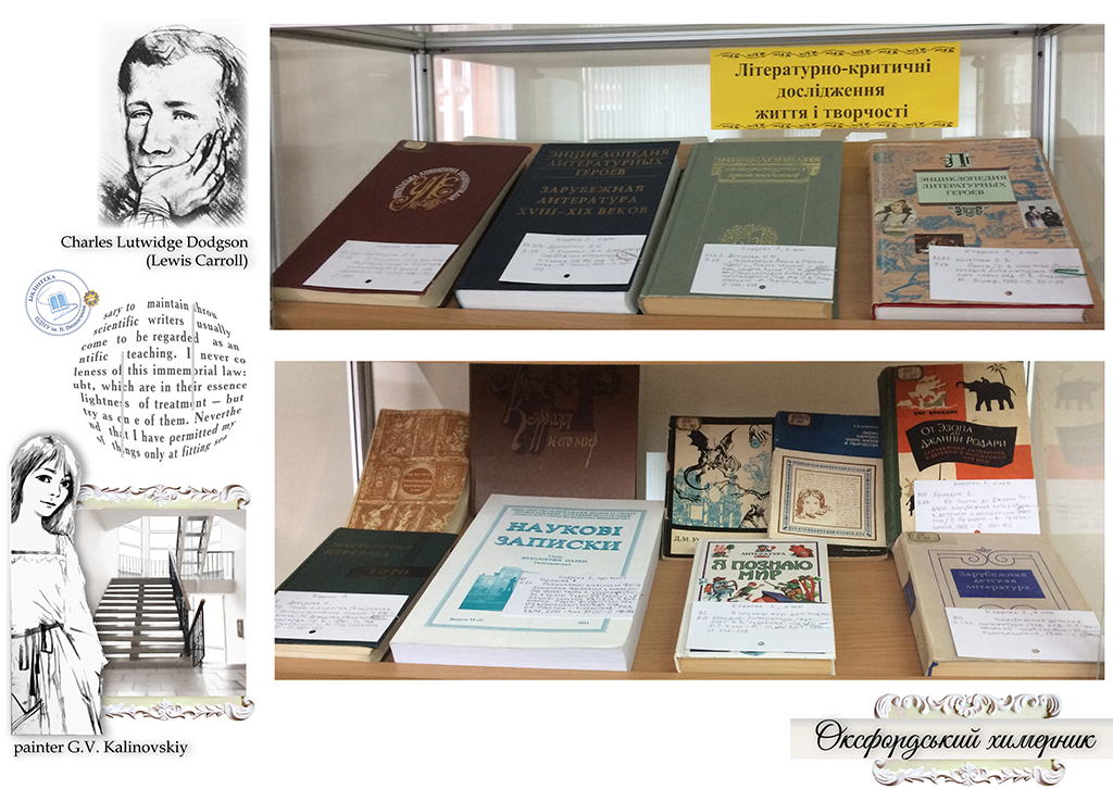 Читальний зал філологічних дисциплін запрошує на перегляд виставки, яка присвячена відомому англійському мрійнику, парадоксалісту, гумористу, професору математику й філософу Льюїсу Керроллу. Його 190-річний ювілей – це 160-річний ювілей його Аліси.