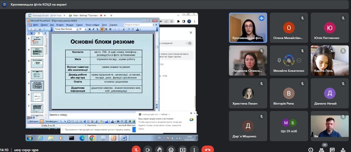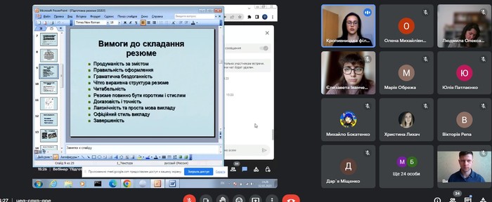 Під час відеоконференції психолог центру Андрущенко Альона Вікторівна ознайомила майбутніх випускників з такими важливими складовими самопрезентації у контексті працевлаштування: