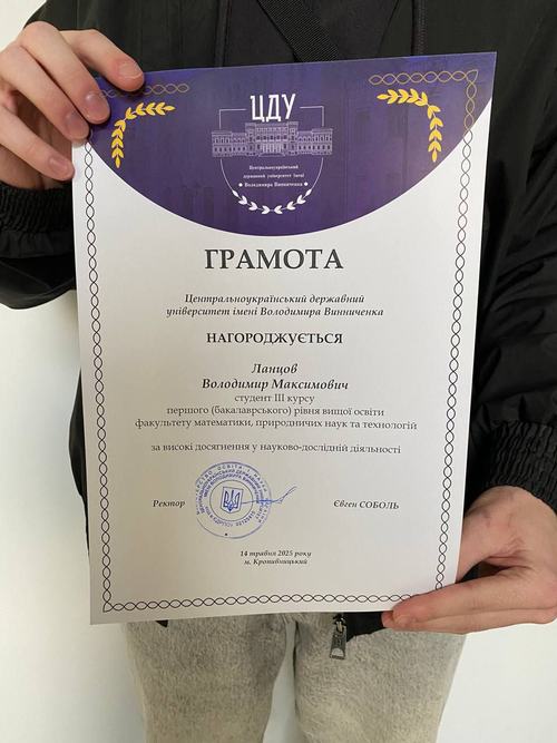 14 травня 2025 року здобувача першого (бакалаврського) рівня вищої освіти групи МЛ22Б спеціальності 073 «Менеджмент» Ланцова Володимира було нагороджено грамотою за високі досягнення у науково-дослідницькій діяльності з нагоди Дня науки.