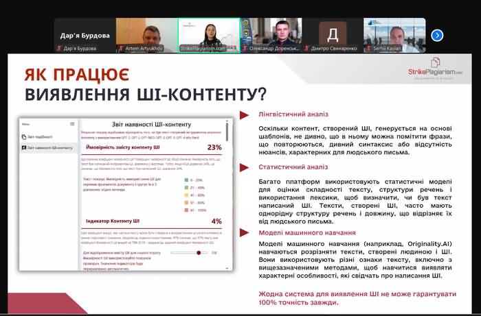 Учасники обговорили ключові питання: інноваційні можливості використання ШІ у науковій роботі, етичні та правові аспекти його застосування, проблеми академічної доброчесності та виклики сучасної науки.