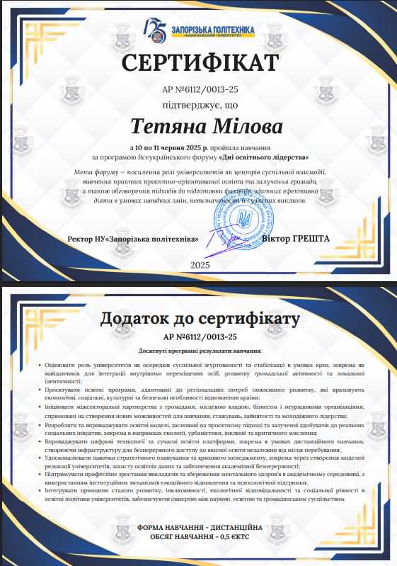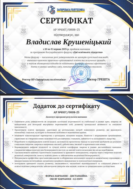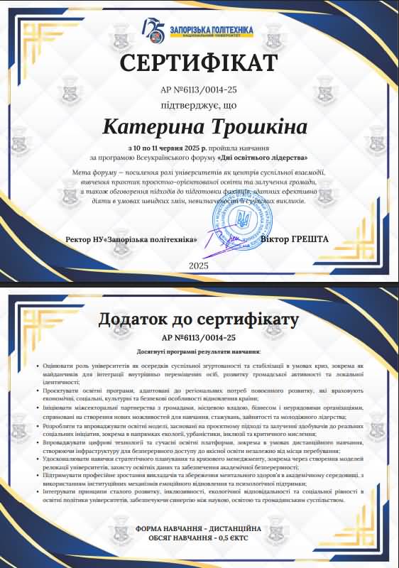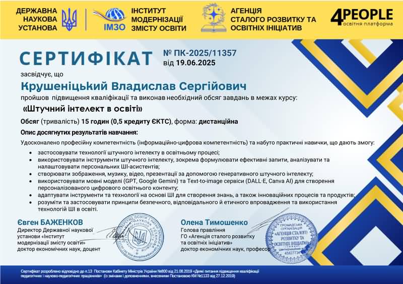 18–19 червня 2025 року Катерина Трошкіна (кандидат юридичних наук, доцент кафедри загальноправових дисциплін та державного управління) та Владислав Крушеніцький (здобувач ОНП «Право» третього (освітньо-наукового) рівня вищої освіти) пройшли Всеукраїнський практичний онлайн-курс «Штучний інтелект в освіті».