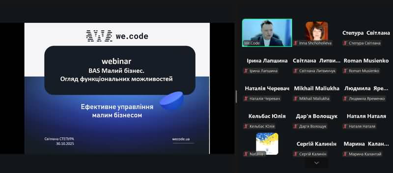 Під час вебінару учасники ознайомилися з функціональними можливостями сучасного програмного продукту «BAS Малий бізнес», який призначений для автоматизації операційної діяльності малого підприємства. Система дозволяє ефективно керувати бізнес-процесами – від продажів і складського обліку до фінансового планування та формування звітності. Експерти компанії WE.CODE поділилися практичними рекомендаціями щодо ефективного впровадження автоматизації у малому бізнесі без значних фінансових витрат, продемонстрували приклади використання BAS Малий бізнес для підвищення продуктивності управлінських процесів.