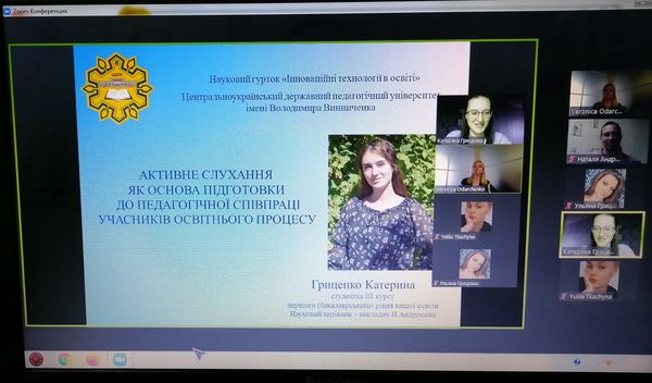 Гриценко К. А., студентка 3 курсу першого (бакалаврського) рівня вищої освіти «АКТИВНЕ СЛУХАННЯ ЯК ОСНОВА ПІДГОТОВКИ ДО ПЕДАГОГІЧНОЇ СПІВПРАЦІ УЧАСНИКІВ ОСВІТНЬОГО ПРОЦЕСУ». Науковий керівник – викладач Н. М. Андросова;