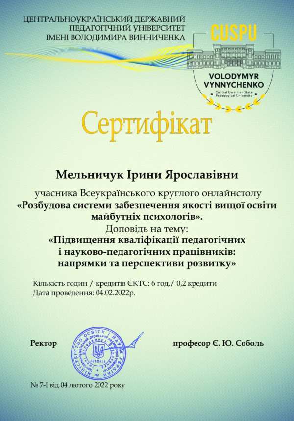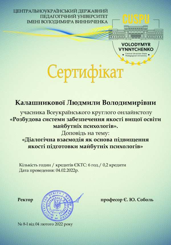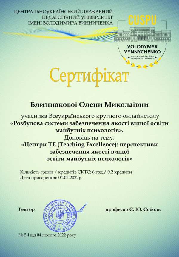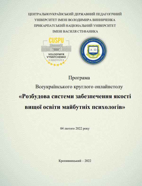 4 лютого 2022 р. в онлайн-режимі відбувся Всеукраїнський круглий стіл «Розбудова системи забезпечення якості вищої освіти майбутніх психологів», присвячений обговоренню актуальних проблем та обміну досвідом щодо розвитку й ефективного використання доробків у навчально-виховному процесі підготовки майбутніх психологів. Ініціатором його проведення виступила кафедра психології факультету педагогіки, психології та мистецтва Центральноукраїнського державного педагогічного університету імені Володимира Винниченка. Співорганізатори заходу – кафедра психології розвитку факультету психології Прикарпатського національного університету імені Василя Стефаника.
