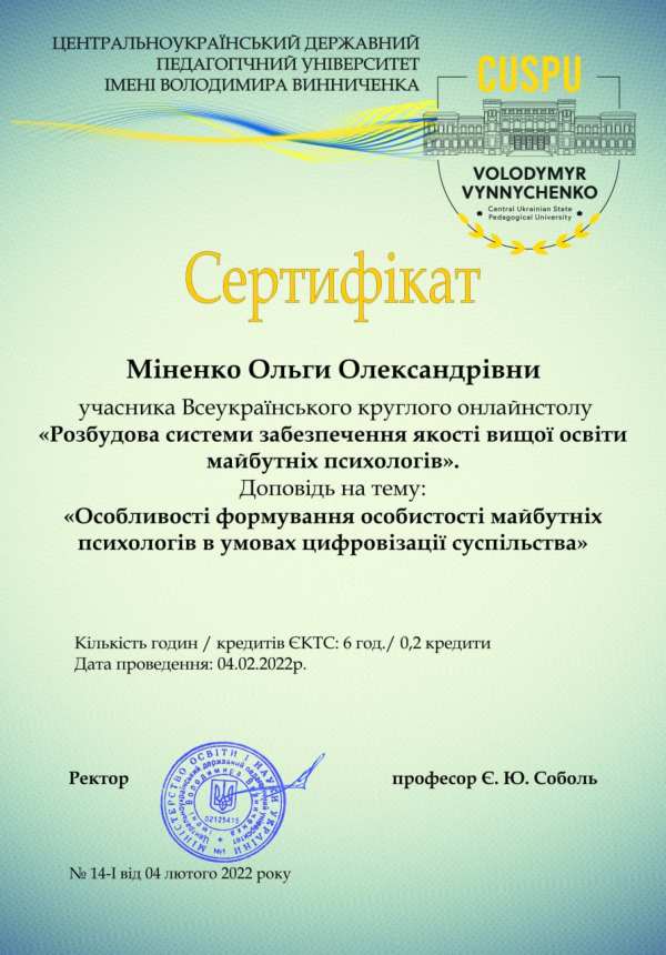 Підсумовуючи результати проведення Всеукраїнського круглого онлайн-столу, варто зазначити, що всі учасники-доповідачі заходу отримали сертифікати. Дякуємо усім, хто долучився до цього заходу та сподіваємося на подальші зустрічі з однодумцями.