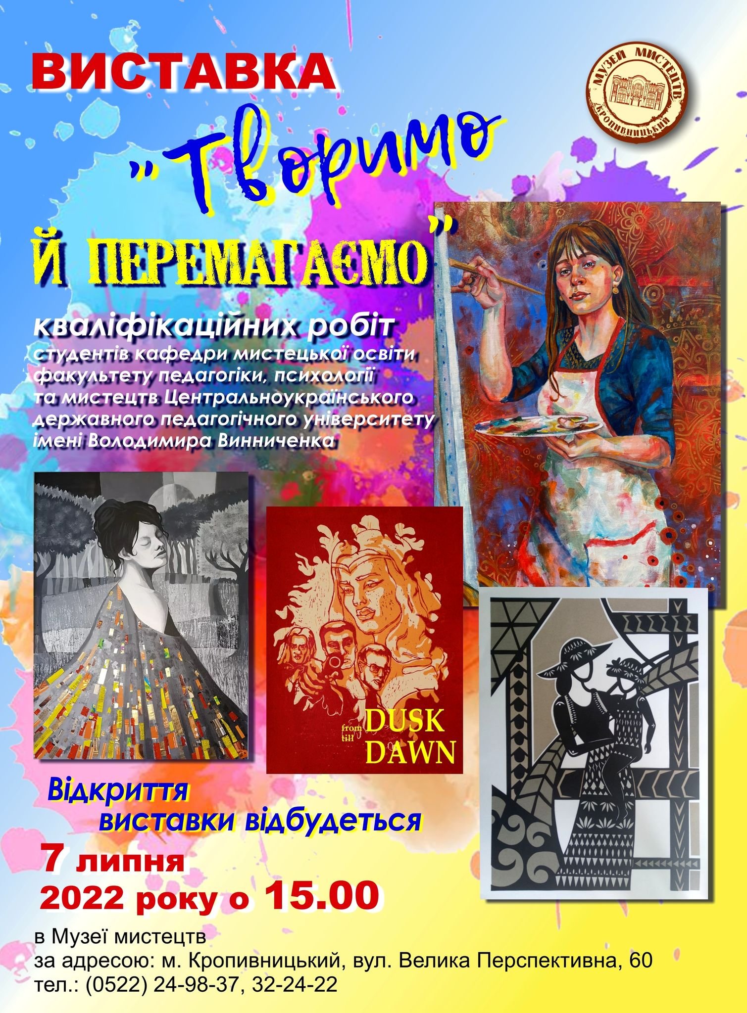 7 липня 2022 року в Музеї мистецтв відкрилася виставка «Творимо й перемагаємо!», на якій представлені кваліфікаційні роботи студентів кафедри мистецької освіти факультету педагогіки, психології та мистецтв Центральноукраїнського державного педагогічного університету імені Володимира Винниченка.