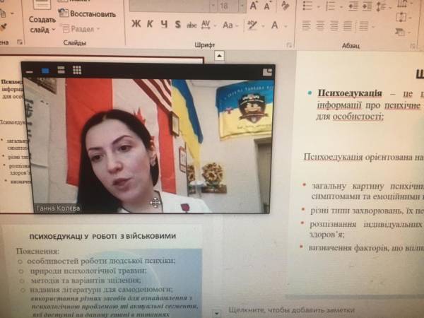 Своїм практичним досвідом з учасниками семінару поділилась Ганна Колєва – практичний психолог і координатор центру психологічної реабілітації КНП «Обласний клінічний госпіталь». Вона представила на обговорення свою доповідь на тему «Психоедукація, як елемент надання комплексної психологічної допомоги військовослужбовцям». (Відео, Презентація)
