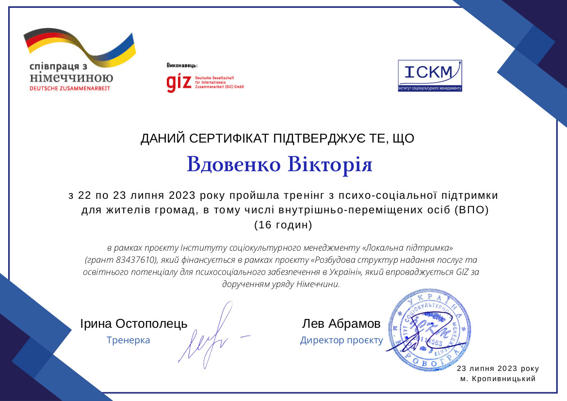 22-23 липня доцентка кафедри дошкільної та початкової освіти, членкиня ГО «Асоціація дошкільників України» Вікторія Вдовенко та доцентка кафедри технологічної та професійної освіти Ольга Пуляк взяли участь у тренінгу з психосоціальної підтримки для жителів громад, в тому числі ВПО. Тренеркою виступила кандидатка психологічних наук Ірина Остополець. Захід відбувся в рамках ініціативи Інституту соціокультурного менеджменту (ІСКМ) «Локальна підтримка», що є частиною проєкту «Розбудова структур надання послуг та освітнього потенціалу для психосоціального забезпечення в Україні», який впроваджується GIZ за дорученням Уряду Німеччини.