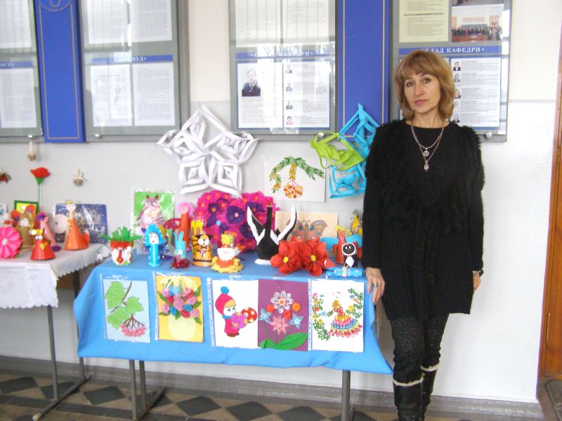 Доцент кафедри методик дошкільної та початкової освіти Котелянець Наталія Валеріївна , яка веде курси «Трудове навчання у початкових класах», «Технологія вивчення освітньої галузі «Технології», подала на виставку навчально-творчі роботи, які були виконані студентами під час практичних занять та у позанавчальний час. Були представлені колективні творчі проекти, композиції з дерева та паперу, вироби з пап’є-маше та ниток, м’які іграшки, вироби гачком та спицями, картини.