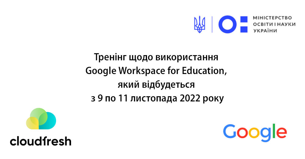 Міністерство освіти і науки України інформуємо про можливість взяти участь у тренінгу щодо використання Google Workspace for Education, який відбудеться з 9 по 11 листопада 2022 року.